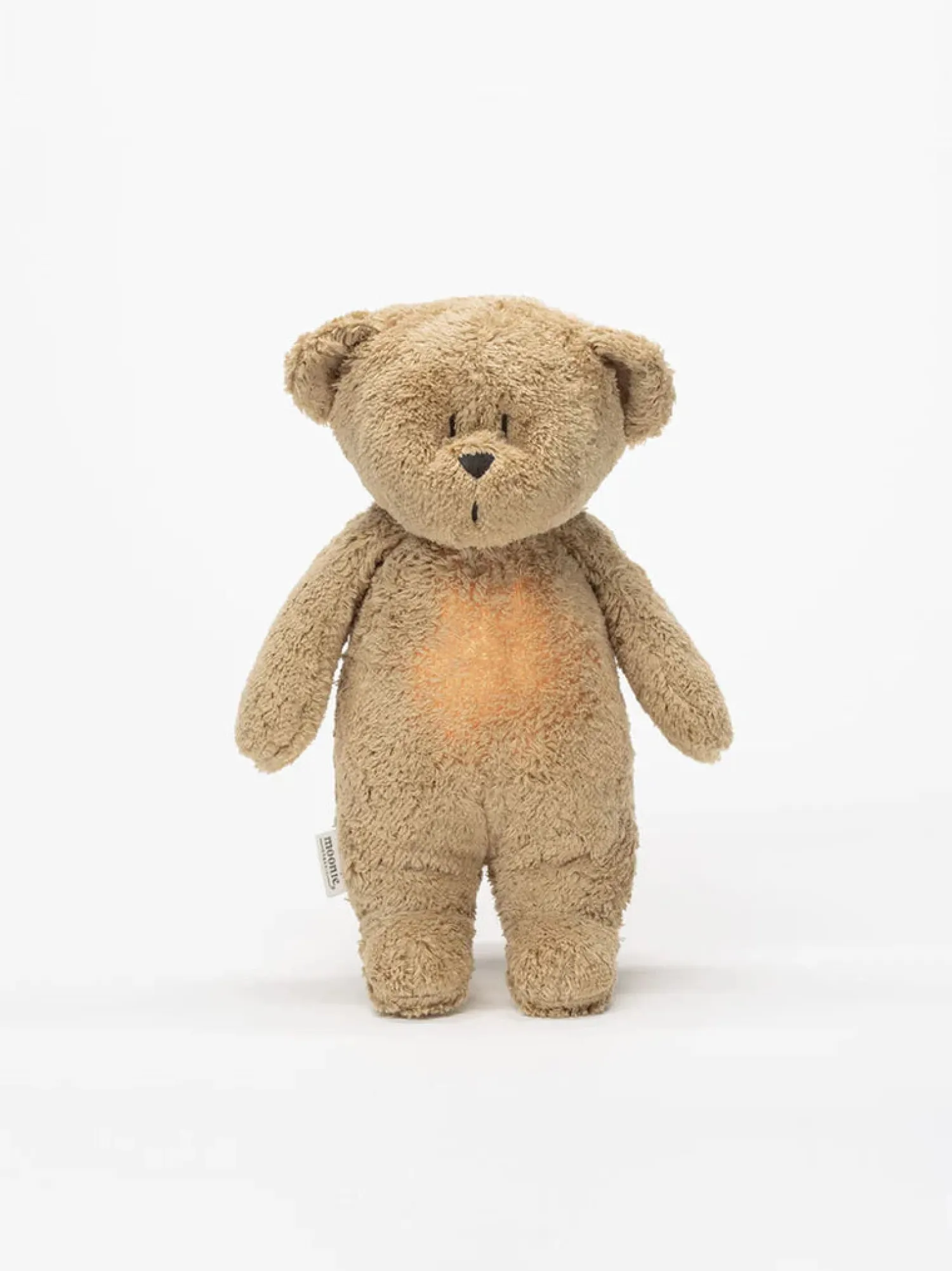 Moonie Bjørnen 2.0 er fremstillet i økologisk bomuld og udstyret med genopladelig lyd- og lysmodul. Den er nem at bruge, sikker for selv nyfødte og en smuk del af både soveværelset og hverdagen.
