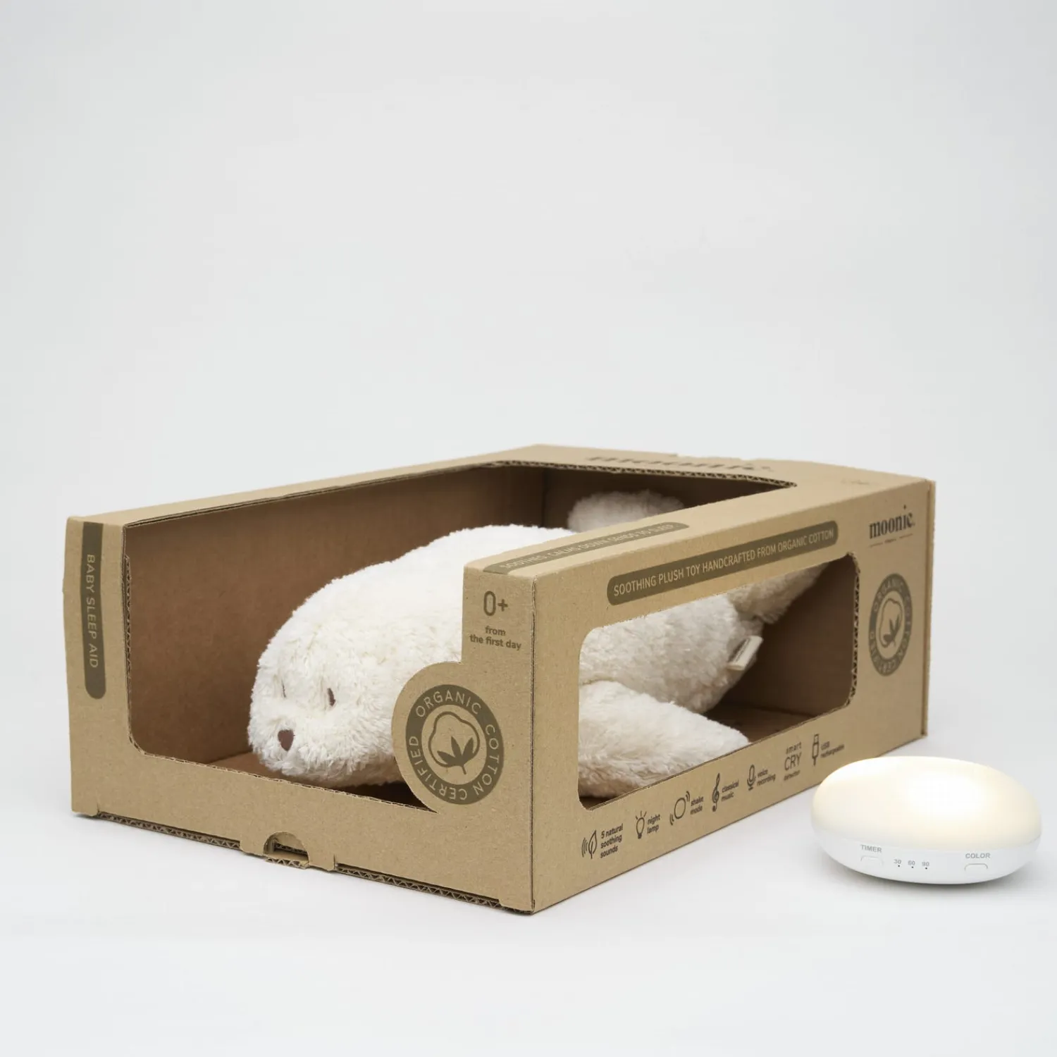 Moonie sælen er fremstillet i økologisk bomuld og udstyret med genopladelig lyd- og lysmodul. Den er nem at bruge, sikker for selv nyfødte og en smuk del af både soveværelset og hverdagen.