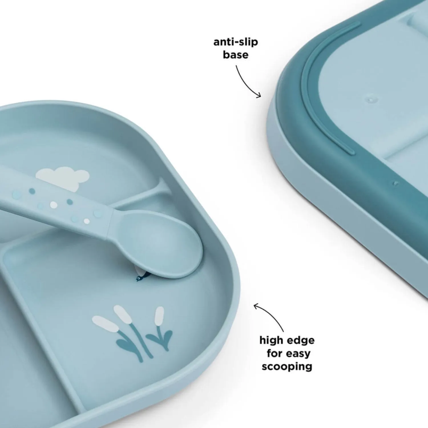Denne tallerken er designet med praktiske funktioner, herunder en antiskrid-base, tre opdelinger til mad, og materialer af høj kvalitet. Den er ideel til børn fra 0 år og opefter, og måler 22 x 18 x H 2 cm.
