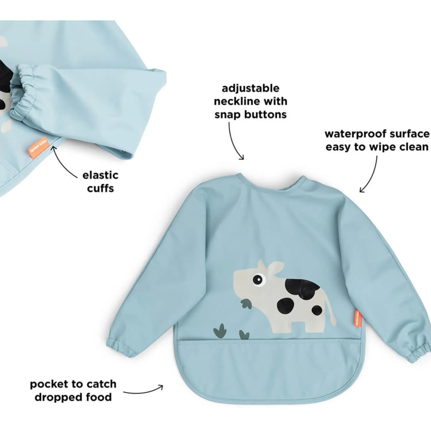 DonebyDeer Blå Hagesmæk m/Ærmer og lomme Tiny farm er den perfekte følgesvend til dit barns måltider! Med fokus på sikkerhed og komfort er denne hagesmæk certificeret til at opfylde høje standarder, så du kan have ro i sindet.