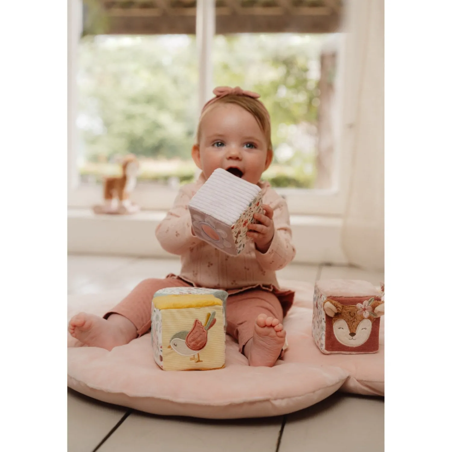 Terningerne er lavet i blød plyskvalitet, som er sikker og behagelig at røre ved. Deres lette design gør dem nemme for små hænder at gribe, hvilket er ideelt for børn helt fra nyfødt. Med sjove mærkater, forskellige teksturer og et charmerende blomsterspejl tilbyder disse terninger både underholdning og uddannelse.