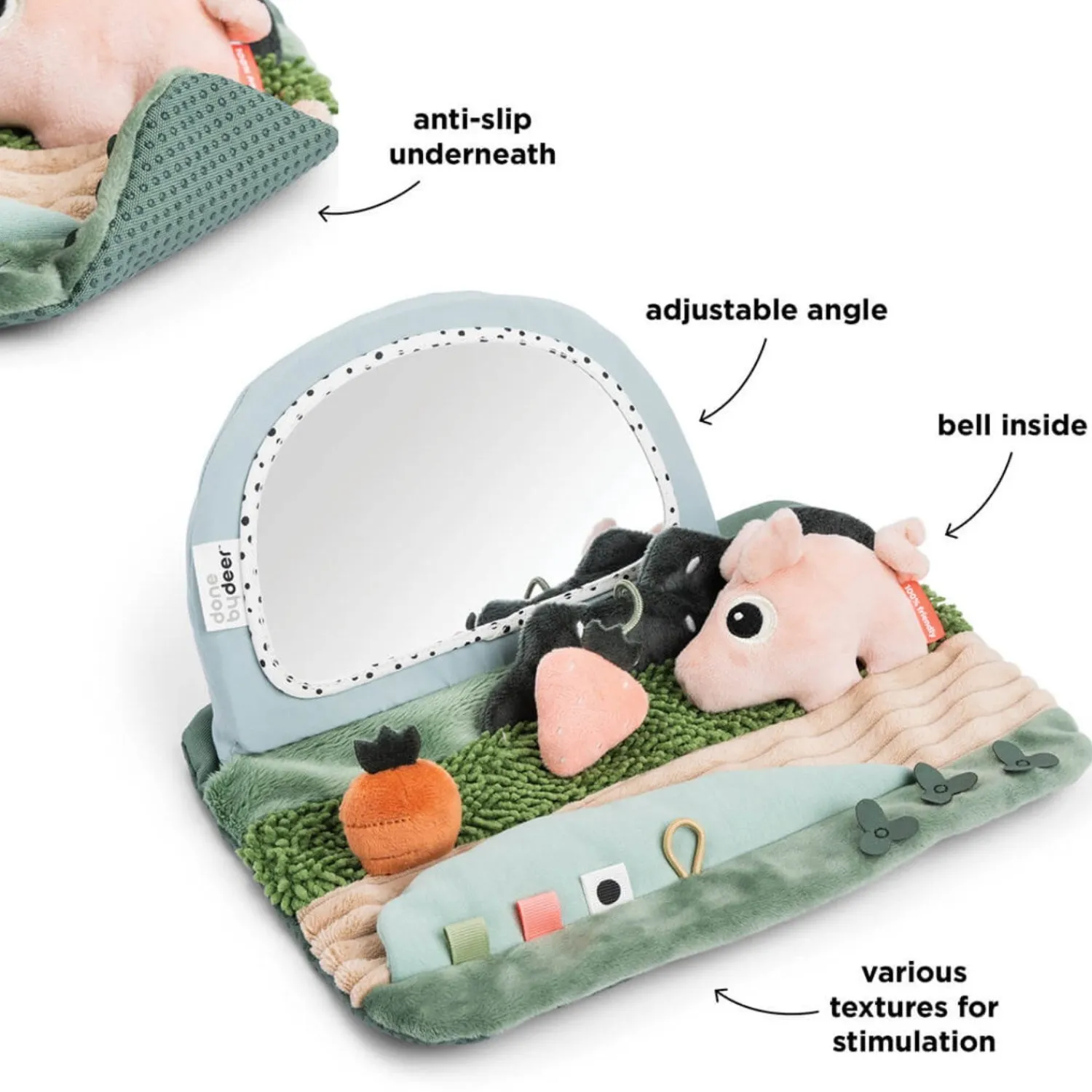Med sensoriske elementer som en rangle, en klokke, knitrende stof og forskellige teksturer, stimuleres dit barns hørelse og taktile sanser. Du kan justere spejlets vinkel, så det passer til dit barns udviklingstrin, og det bløde spejl er sikkert for babyer at lege med. Det praktiske antiskrid-underlag holder legetøjet sikkert på plads under legen, mens de sjove kontraster og farverige elementer bidrager til visuel stimulering.