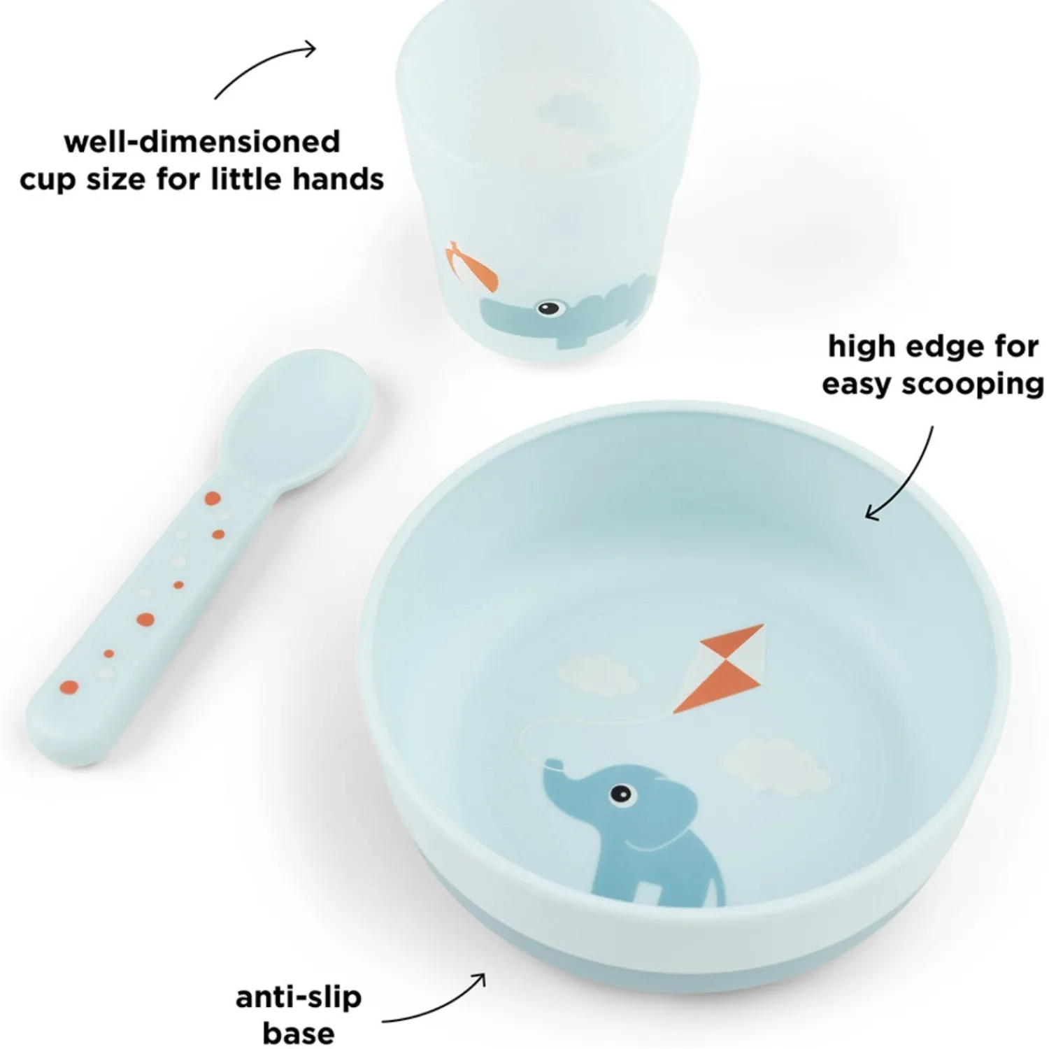 Skålen er designet med en skridsikker bund, så den forbliver stabil på bordet under måltidet. Praktisk mikroovnssikkerhed og nem rengøring i opvaskemaskinen gør dette sæt både bekvemt og sikkert at bruge – fri for BPA eller ftalater. Det ideelle valg til de første selvstændige måltider!
