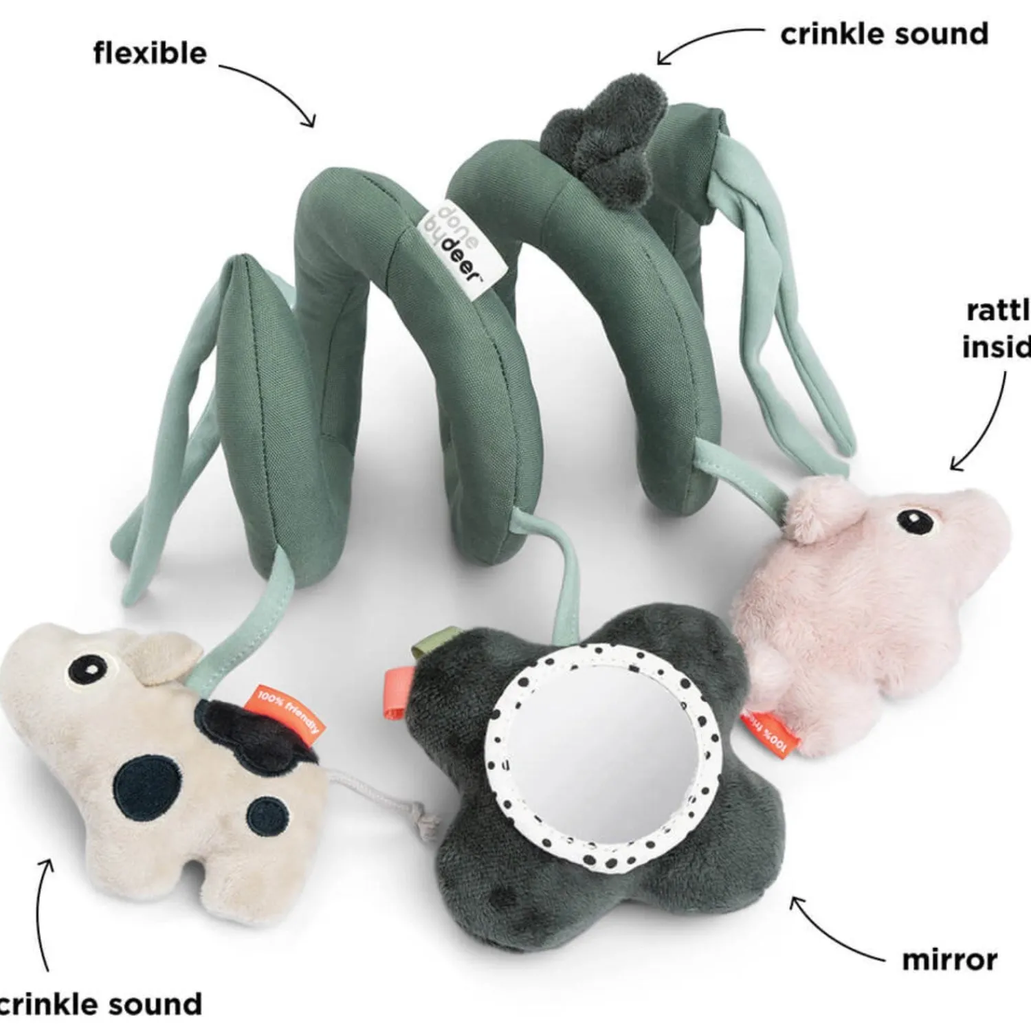 Med sensoriske elementer som en rangle, en klokke og knitren, stimuleres dit barns hørelse og taktile sanser. Lad din baby udforske sig selv og sine refleksioner i spejlet. Den lette spiral kan bindes på sengen, autostolen eller barnevognen og har en sej grøn farve med farverige detaljer og kontraster for visuel stimulering. Deer friends underholder dit barn, mens I er på farten.