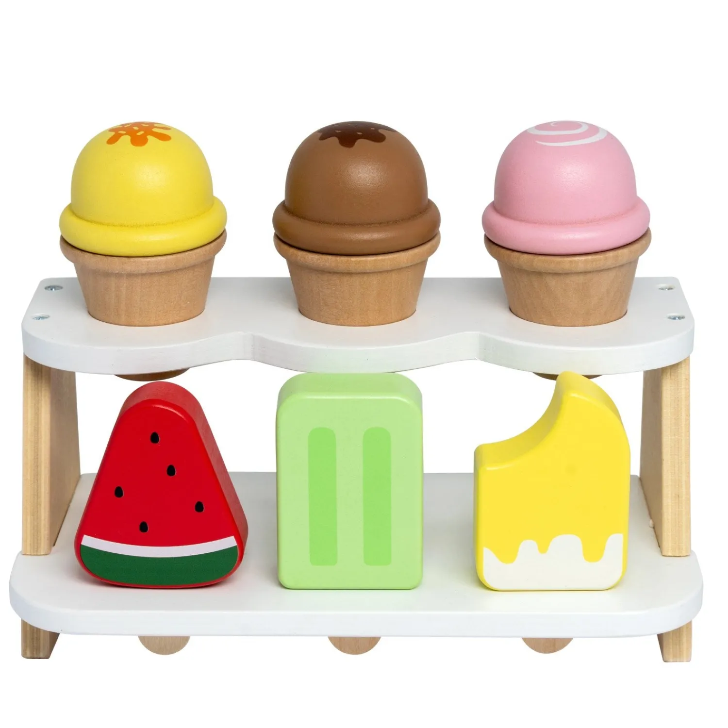 Sættet består af tre farverige is på pind og tre indbydende isvafler, alle lavet af holdbart træ. Med den medfølgende holder bliver det let for de små at udøve deres finmotorik, mens de serverer deres lækre kreationer. Børn vil dykke ned i en fantasifuld verden, hvor de kan være iskioskejere og udvikle både kommunikative evner og evnen til at dele.