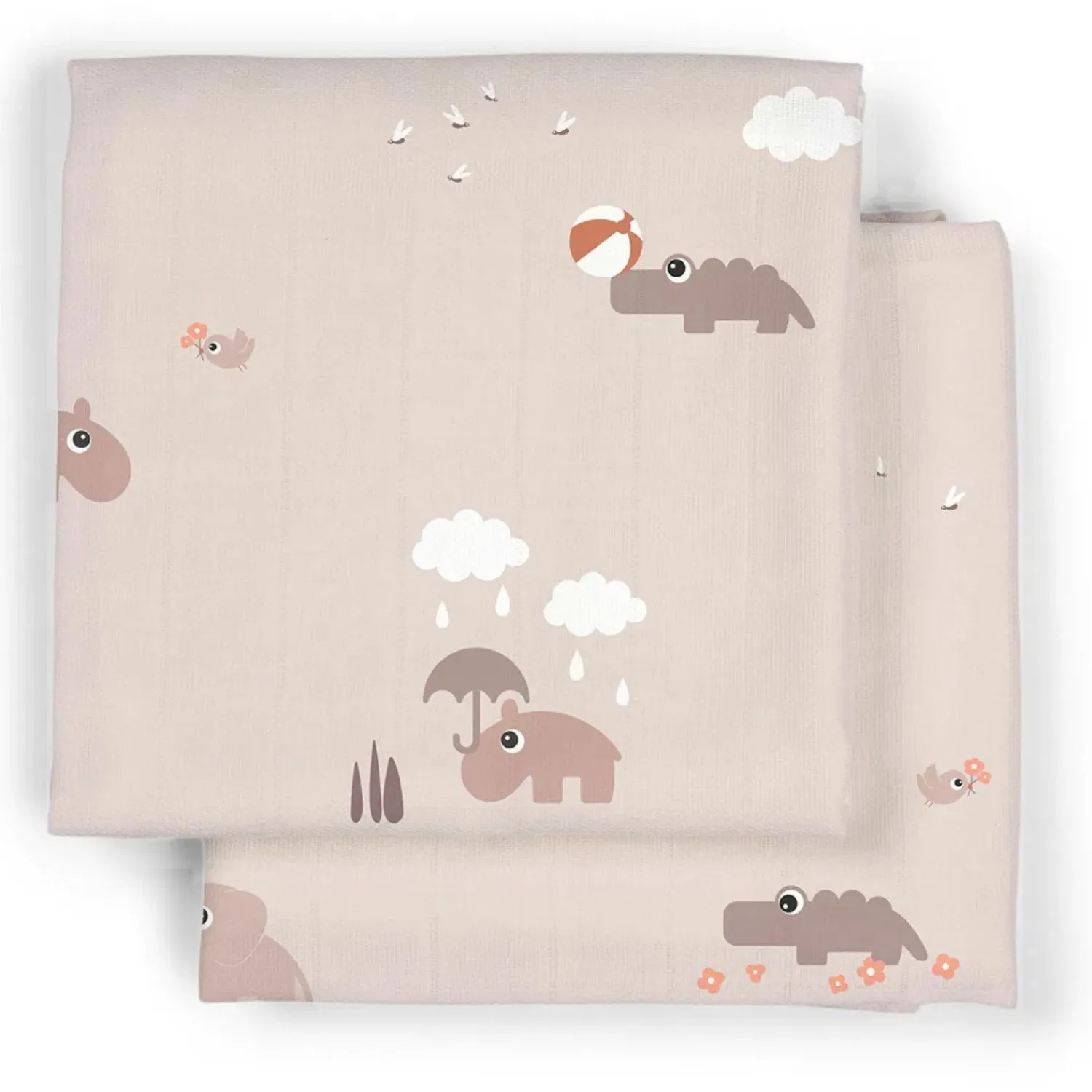 Med en størrelse på 65 x 65 cm er disse stofbleer i en sød pudderfarve med motiver af Croco, Elphee og Nozo. OEKO-TEX® certificeret, åndbar og sikker for din baby.