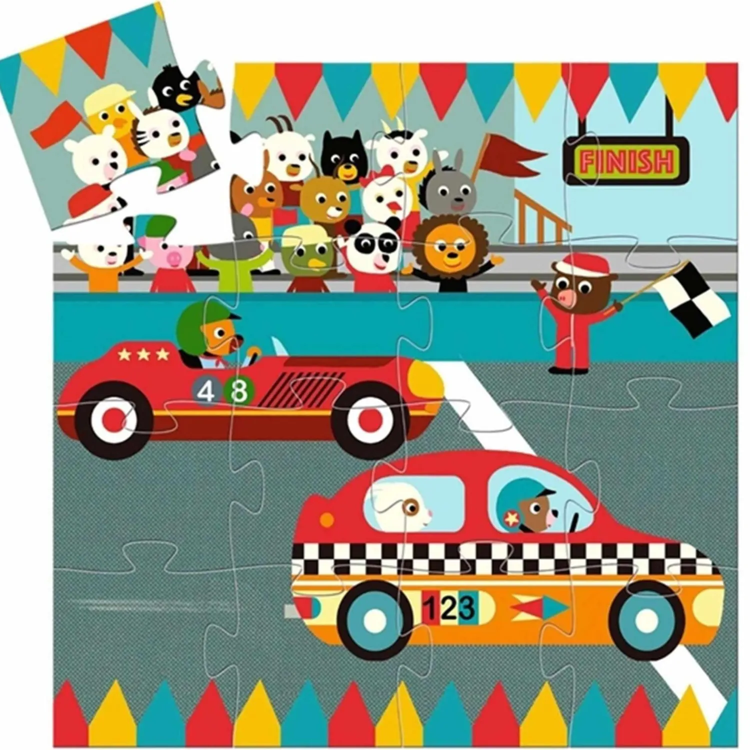 Bring fart og sjov ind i børnenes verden med Djeco Racerbilen puslespil! Dette seje puslespil med racerbiler og dyr vil med garanti bringe smil frem hos de små. Saml hele familien omkring dette underholdende puslespil og nyd kvalitetstid sammen.