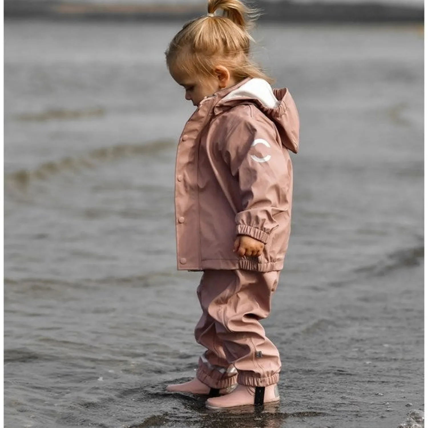 Jakken har en lynlås, trykknaplukning, hagebeskyttelse og en aftagelig hætte, mens bukserne har en justerbar talje for perfekt pasform. De justerbare fodstropper og elastikkanter holder regnen ude, mens børnene leger og hopper i vandpytter.