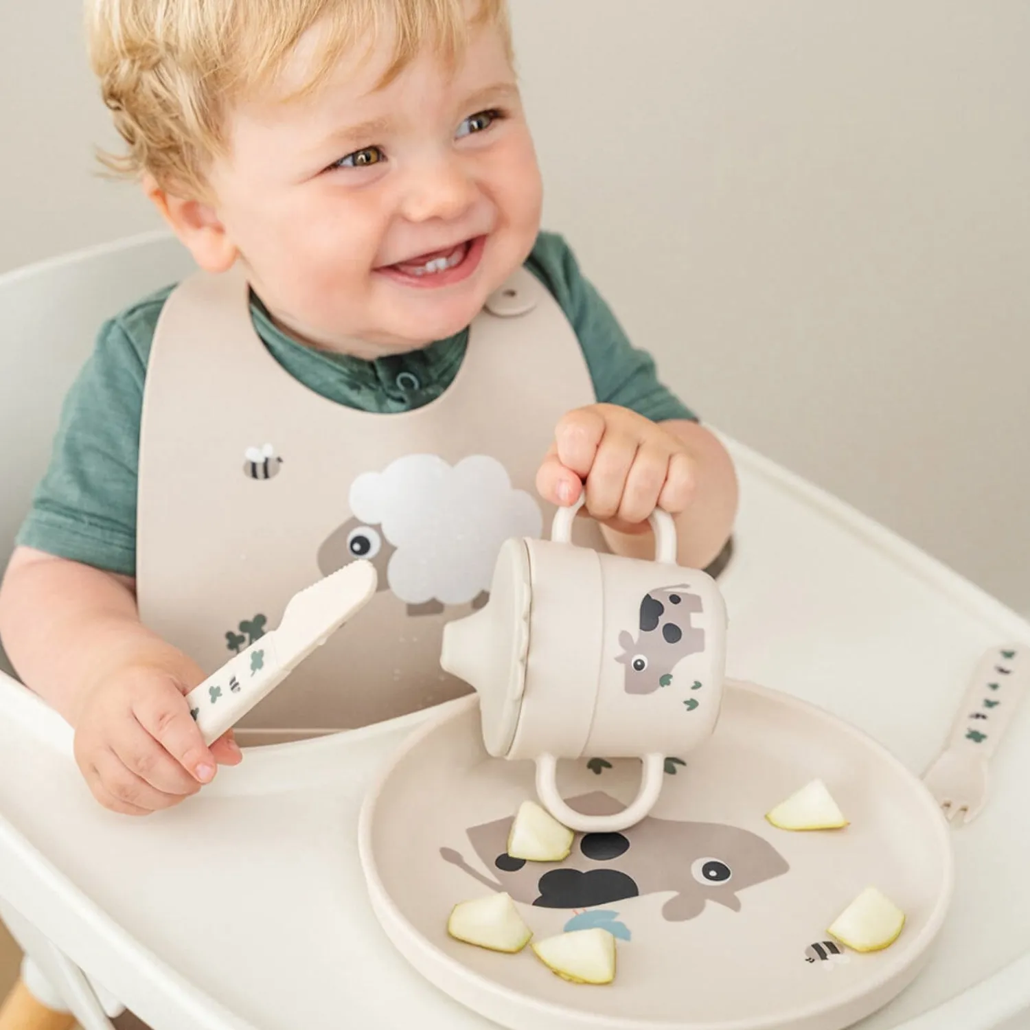 Introducer dit barn til spændende måltider med DonebyDeer Sand Foodie Bestiksæt Tiny Farm. Dette sæt bestik og babyskeer er skabt med fokus på dit barns sikkerhed og komfort under måltiderne. Med en BPA-fri certificering kan du være sikker på en tryg brug, mens de ergonomiske greb gør det let for små hænder at håndtere. Det holdbare design gør det ikke kun nemt at rengøre, men også sjovt at bruge. Lad dit barn udforske madens verden med dette søde bestiksæt.