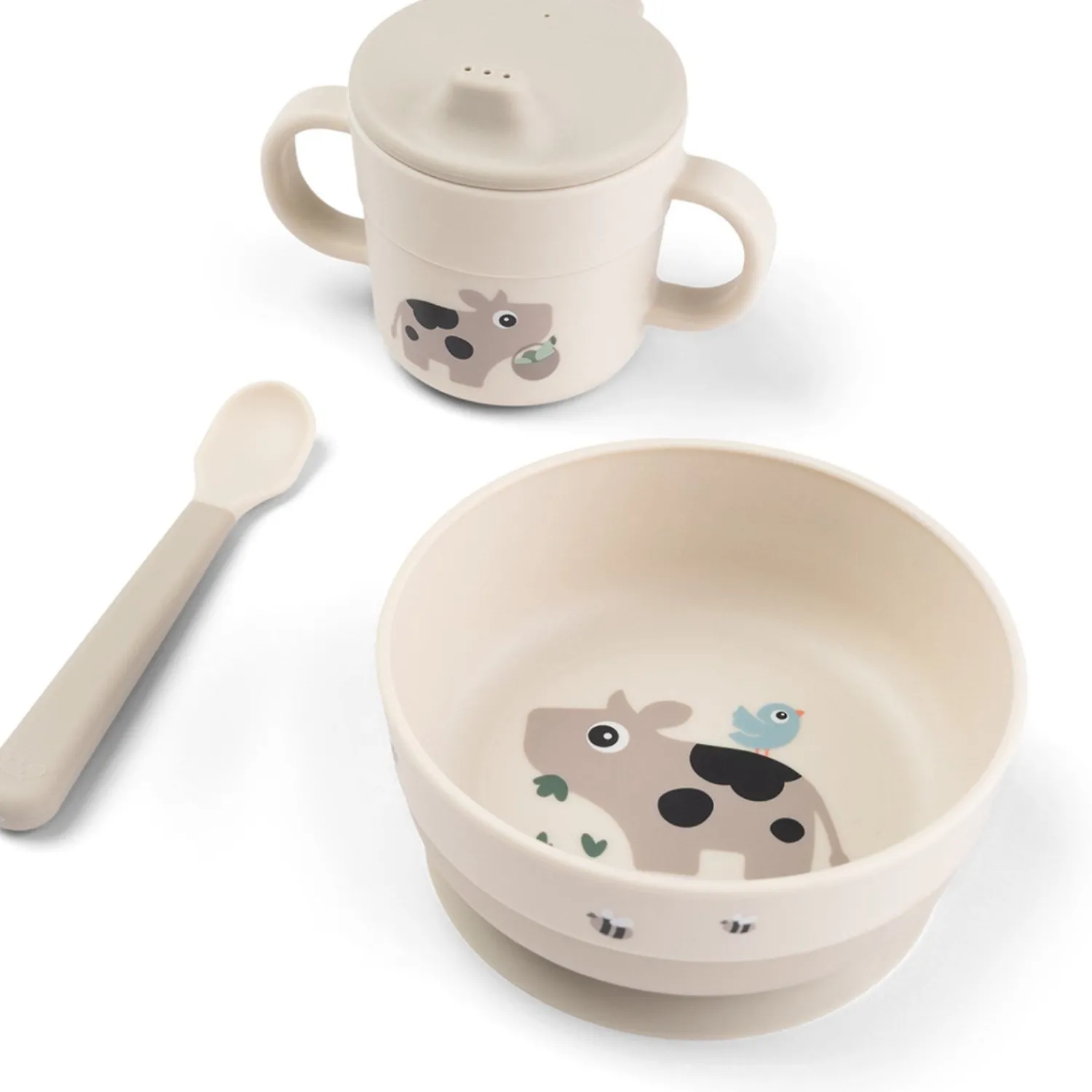Opdag DonebyDeer Sand Foodie Første Spisesæt Med Sugekop Tiny Farm, der kombinerer sjov og sikkerhed under måltiderne. Den smarte sugekopbase på skålen holder den på plads, hvilket reducerer spild og rod, mens den bløde ske gør det nemt for små hænder at gribe om. Det elegante sandfarvede design med Clucky- og Dotti-motiver stimulerer barnets nysgerrighed og gør måltiderne mere spændende. Ideel til at fremme selvstændig spisning og udforske nye fødevarer på en tryg og behagelig måde.