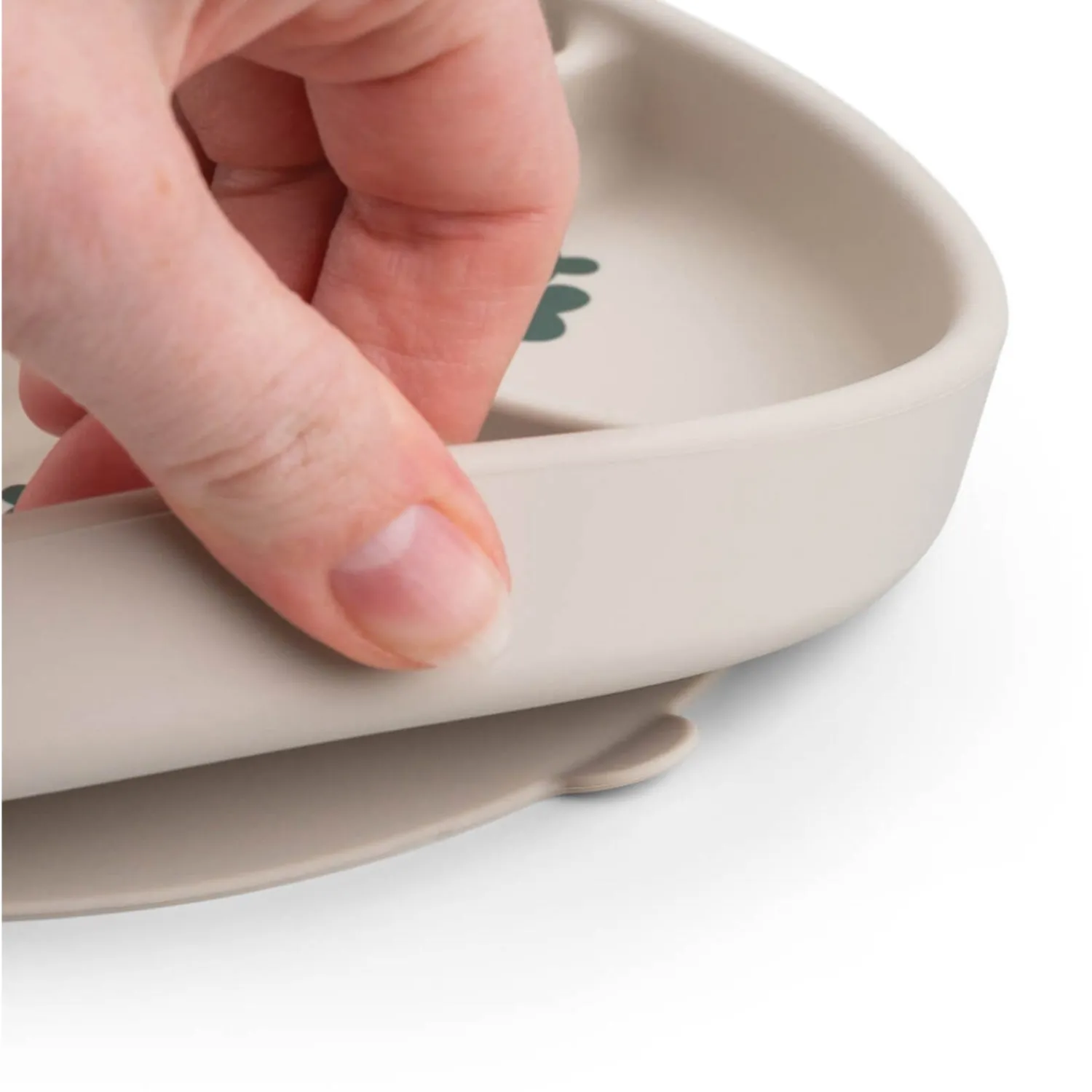 Med en praktisk base med sugekop forhindrer denne tallerken dit barn i at skubbe, vippe eller kaste tallerkenen. Den er fri for BPA og andre skadelige stoffer, samt sikker at bruge i mikroovn, ovn og fryser. Let at rengøre i opvaskemaskinen anbefales det at bruge parfumefri sæbe til silikone. Den holdbare tallerken har en fin sandfarve med et underholdende motiv af Sheepy og Dotti, der vil inspirere dit barn til at udforske madens verden.