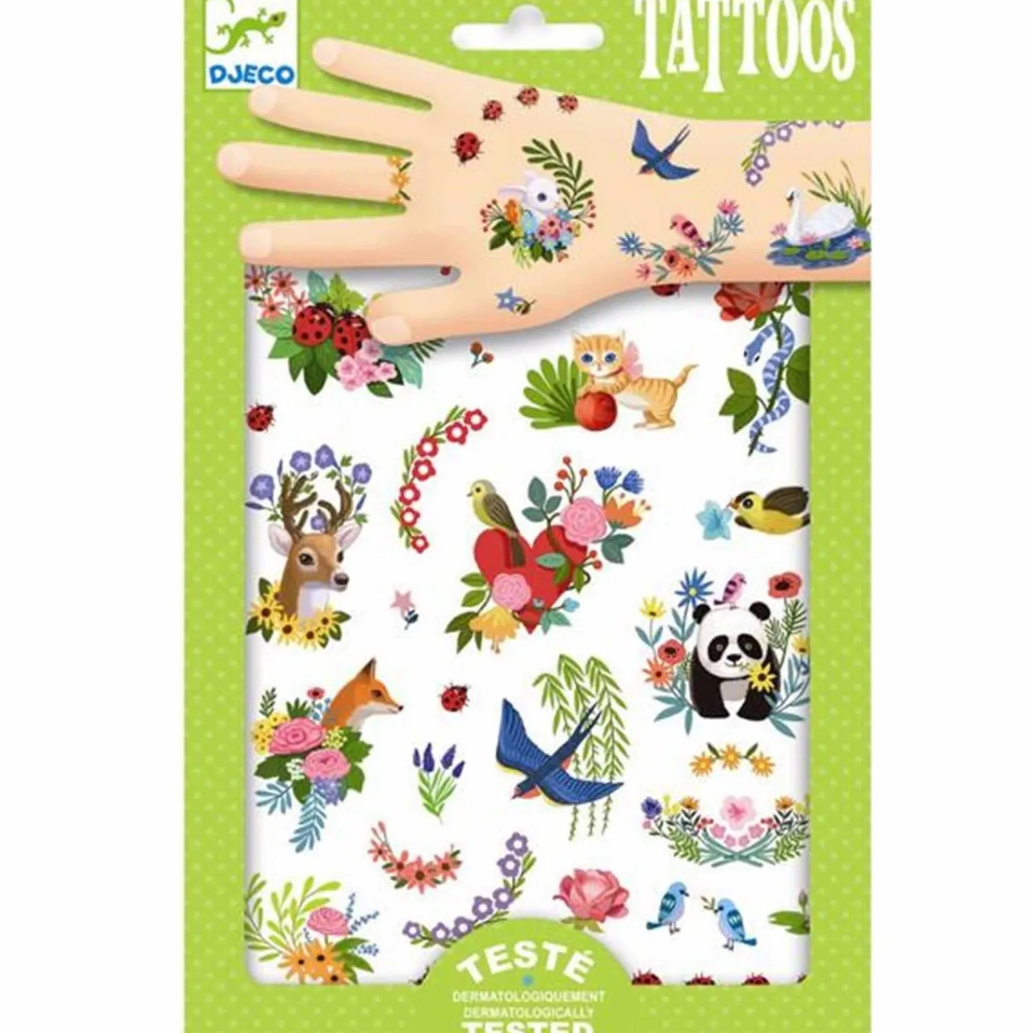 Udforsk verden af farverige tatoveringer med Djeco Tattoos Forår. Disse midlertidige tatoveringer er perfekte til børn, der ønsker at udtrykke deres kreativitet på en sjov og sikker måde. Lette at påføre og nemme at fjerne, disse tatoveringer er velegnede til forskellige aldre og måler 14×23 cm.