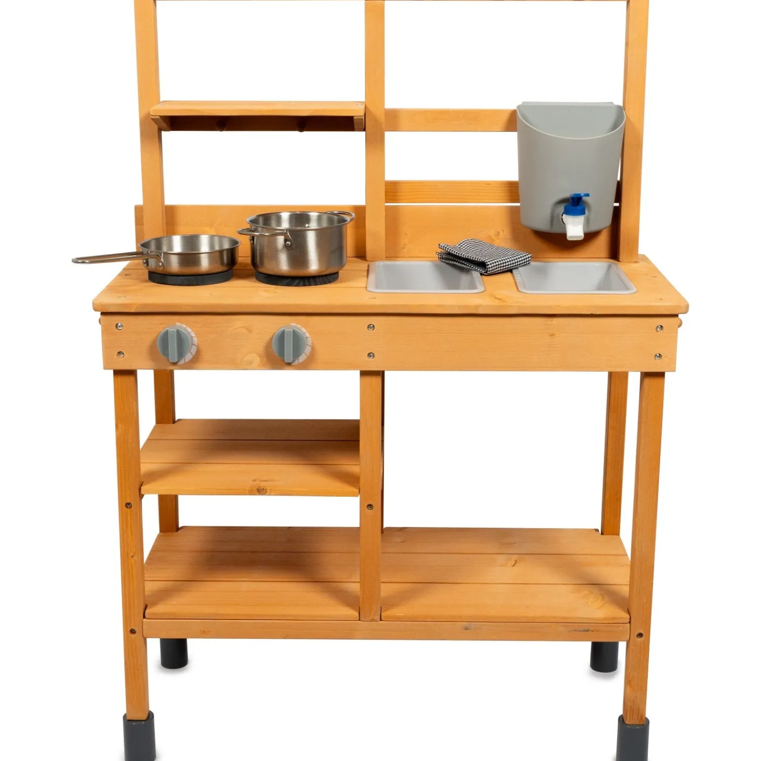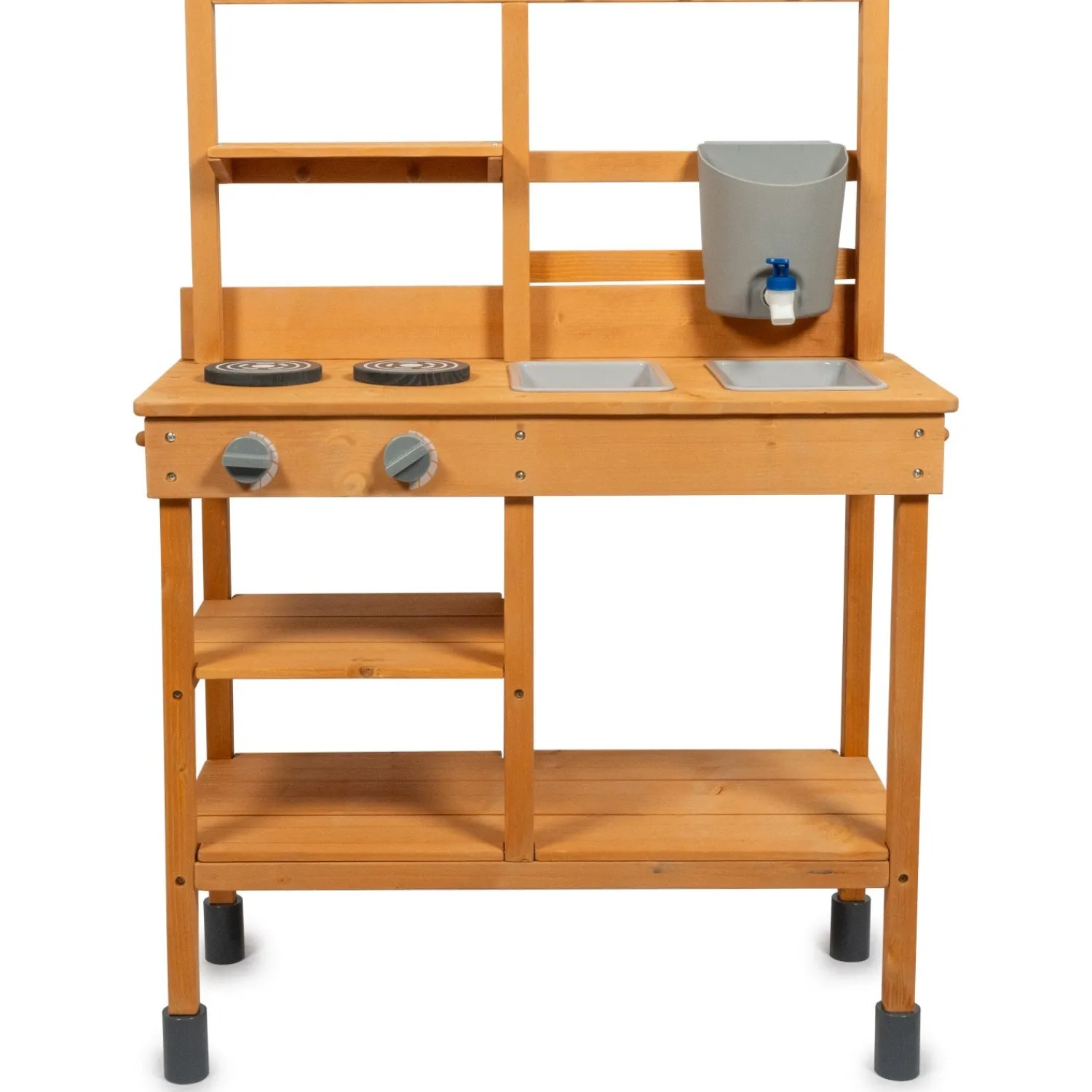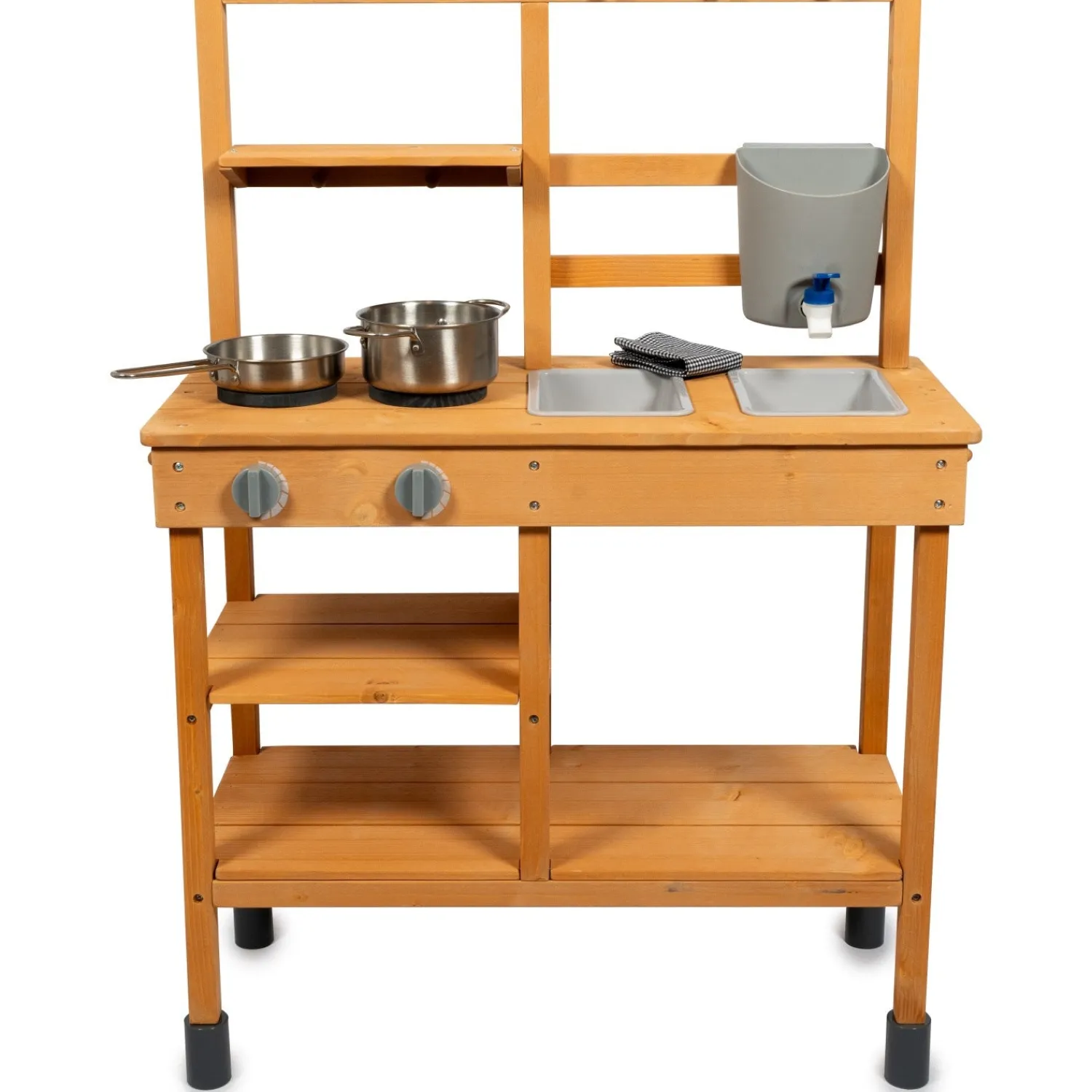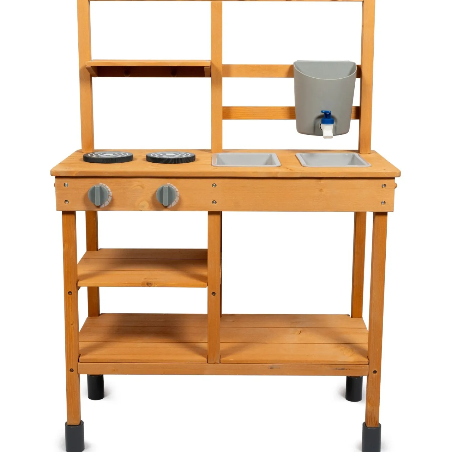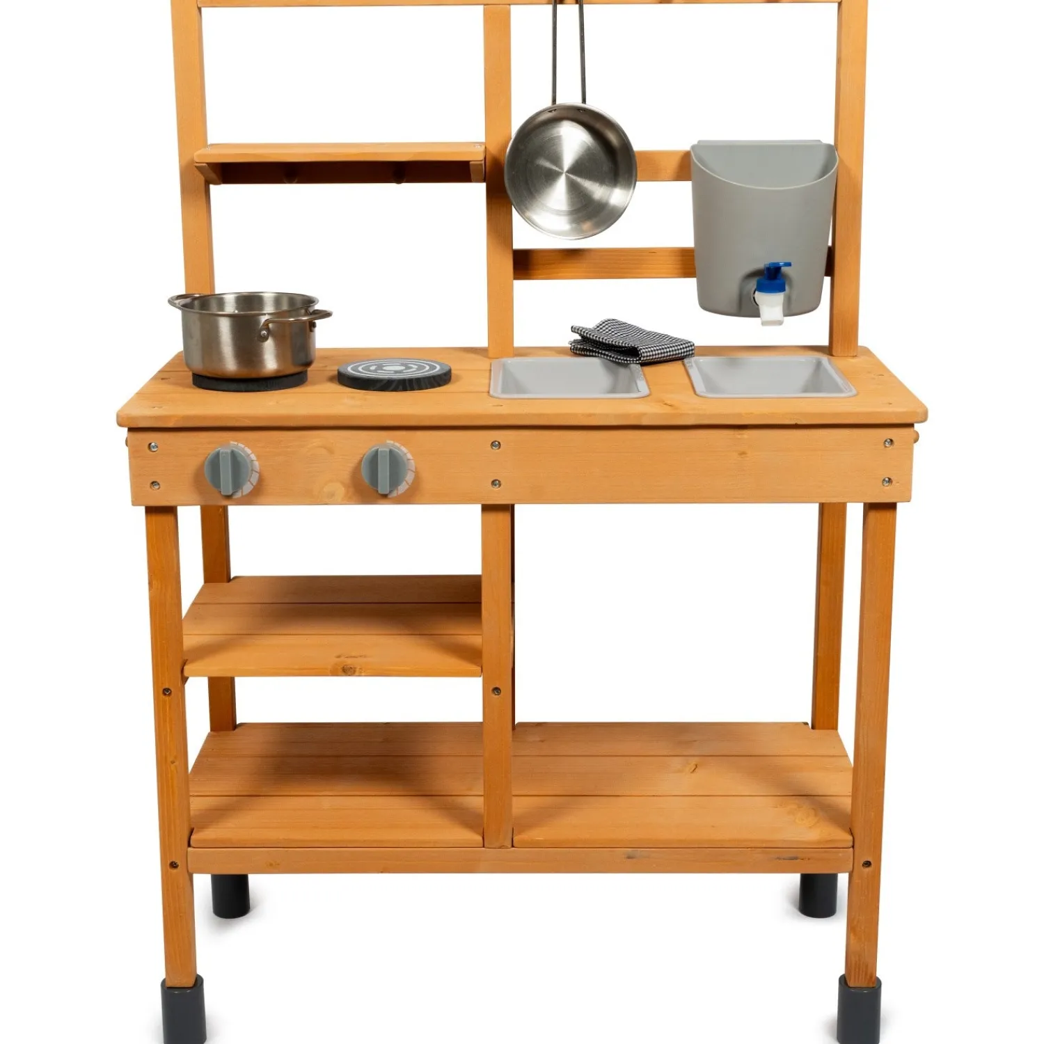 Inviter dine børn til en kulinarisk leg under åben himmel med Mamamemo Udekøkken. Lavet af solidt træ, dette legekøkken er designet til at være både holdbart og sikkert, så børnene kan nyde timer med sjov i enhver vejrtype. Udstyret med en vandbeholder og to skåle, inspirerer det til kreativ leg og madlavningseksperimenter.