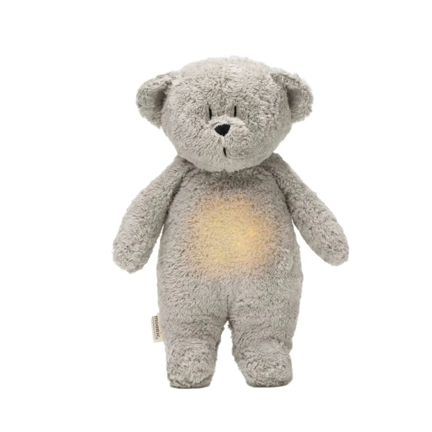 Moonie Bjørnen 2.0 er fremstillet i økologisk bomuld og udstyret med genopladelig lyd- og lysmodul. Den er nem at bruge, sikker for selv nyfødte og en smuk del af både soveværelset og hverdagen.
