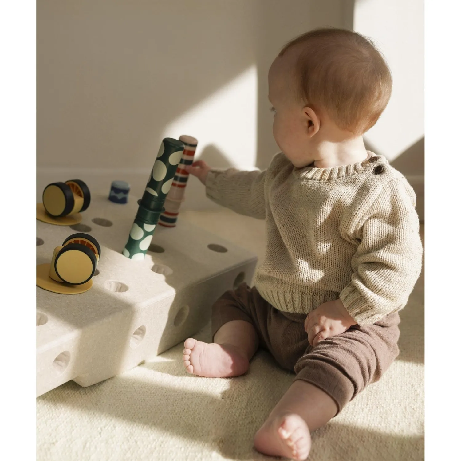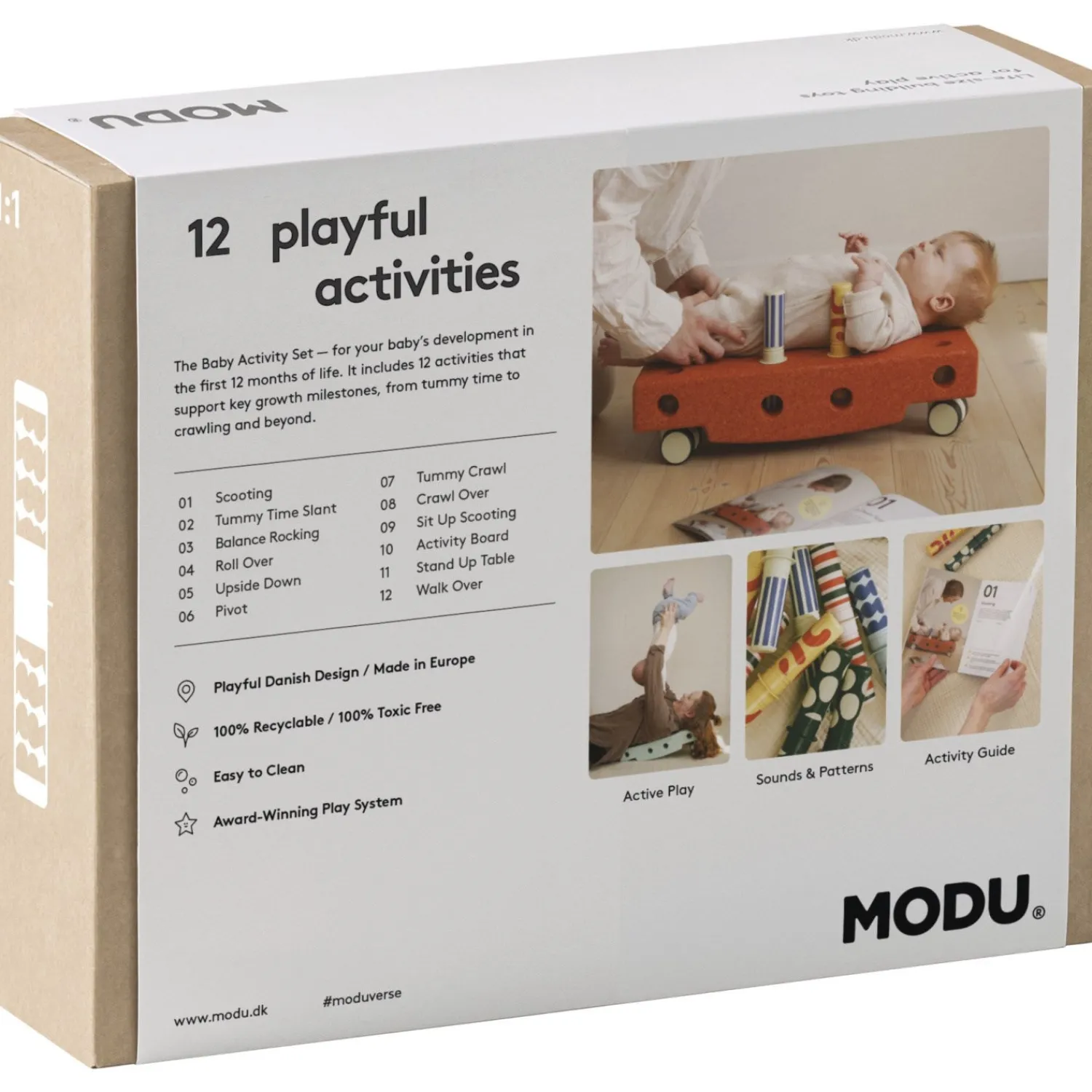 Sættet består af 10 dele, herunder en klods/base, fire drejehjul, fire raslepinde og en babyaktivitetsguide, der vejleder dig i at støtte dit barns motoriske udvikling. Fra 0-12 måneder og op til 50 kg er dette holdbare produkt lavet af 100 % genanvendeligt EPP-skum og ABS-plast. Med dimensionerne 55 x 40 x 10 cm er det nemt at opbevare og transportere. Rengøring er en leg med blot en fugtig klud.