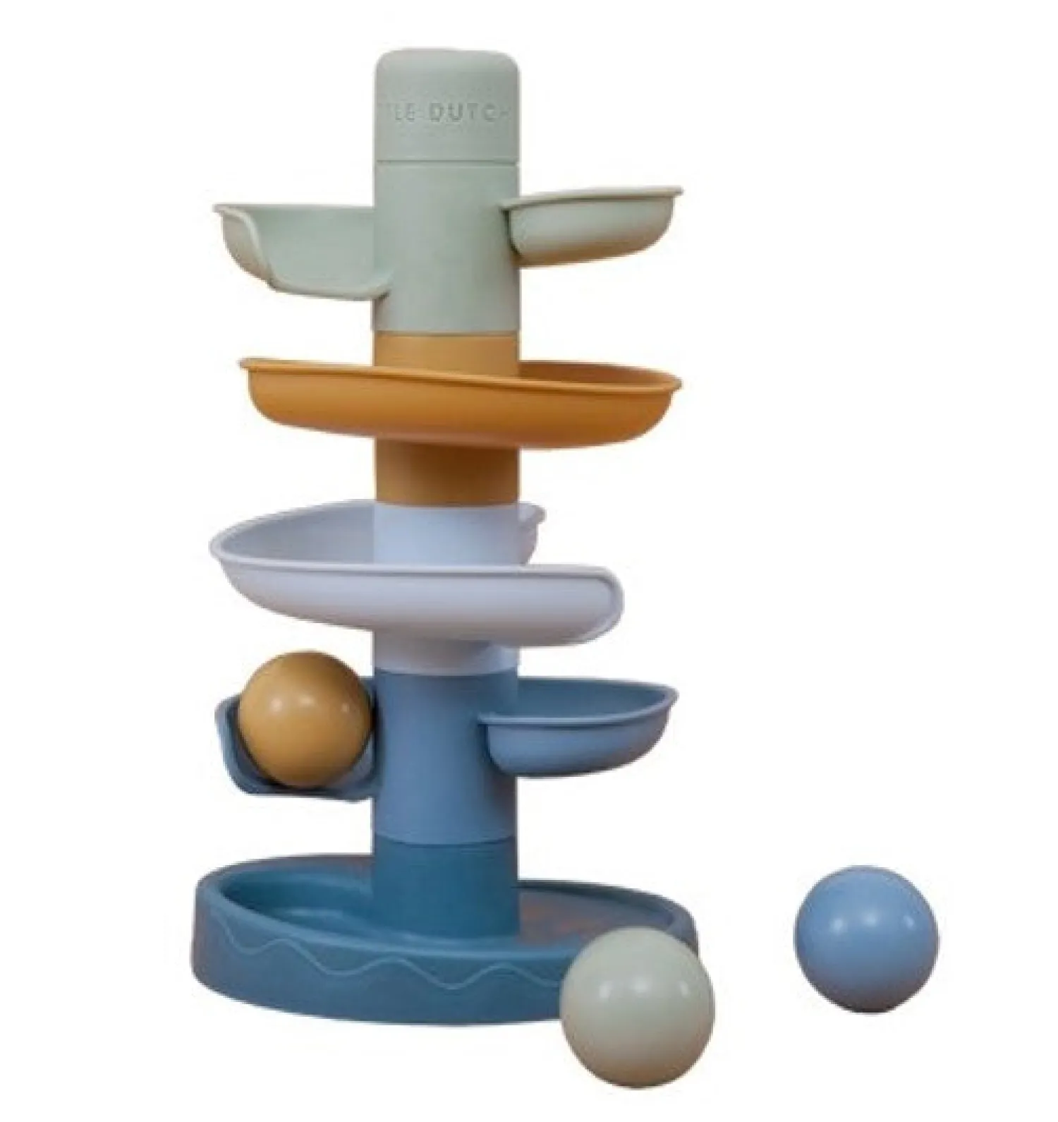 Lad bolden rulle! Det fascinerende spiraltårn søger for masser af spænding. Det farverige legetøj består af 5 bløde dele der er lette at stable for barnet. Slip kuglerne en efter en på toppen og se hvordan hver af dem snor sig og ruller ned. Spiraltårnet forbedrer hånd-øje-koordination og lærer barn om årsag virkning hvilket sikrer, at det er både sjovt og lærerigt. Spiraltårnet kommer med tre store bolde der er lette at holde om og giver lidt lyd når de bevæger sig.