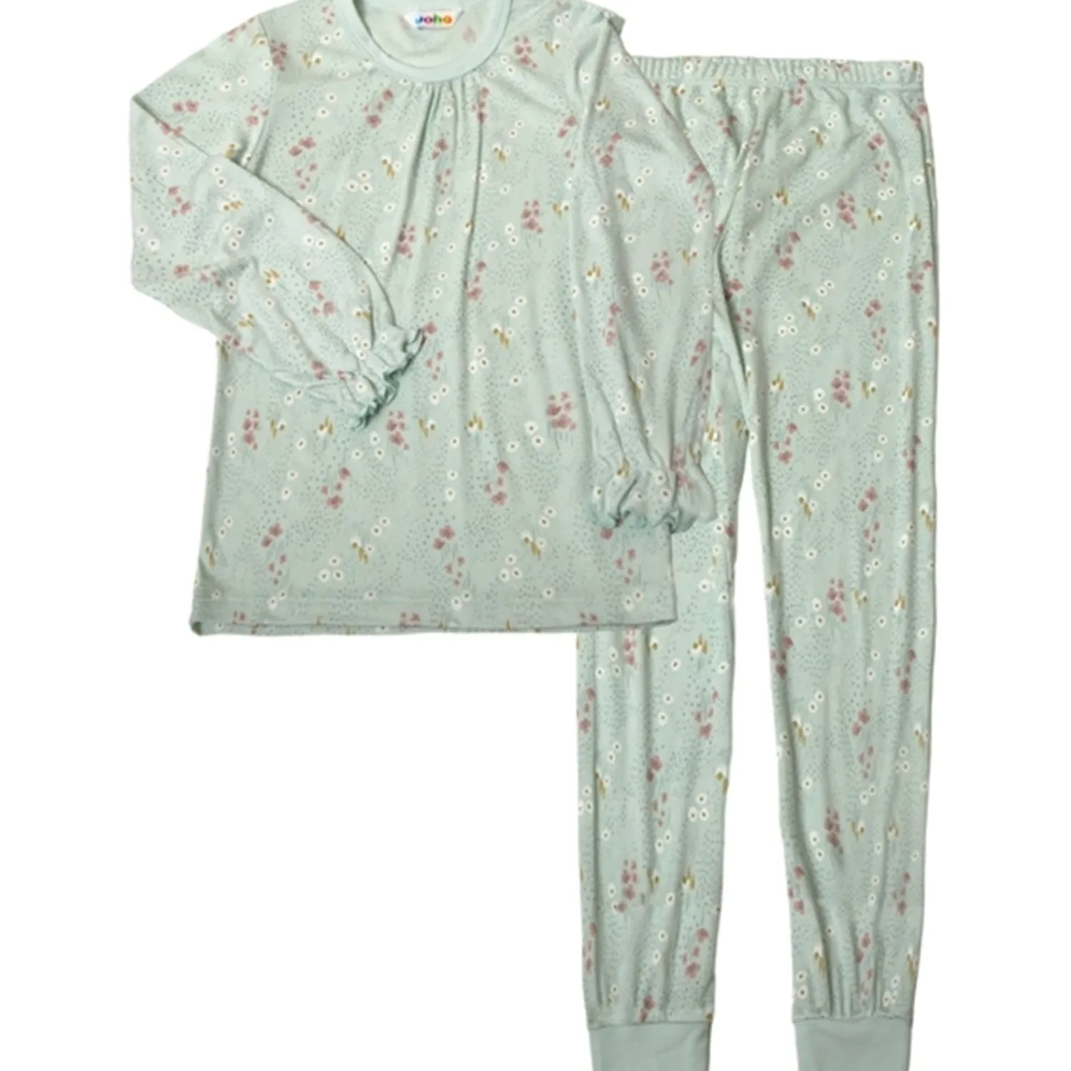 Drøm sødt i dette Joha Bambus Mint AOP pyjamas sæt. Blusen har lange ærmer med en sød rynkeeffekt ved halsen og håndleddene. Det fine print og de ensfarvede kanter giver et stilfuldt touch. De ensfarvede leggings har en god elastik i taljen for ekstra komfort. Hele sættet er lavet af en utrolig blød kvalitet baseret på 100% økologisk bambus, som er behagelig at have på. Certificeret med Oeko-tex 100 mærket.