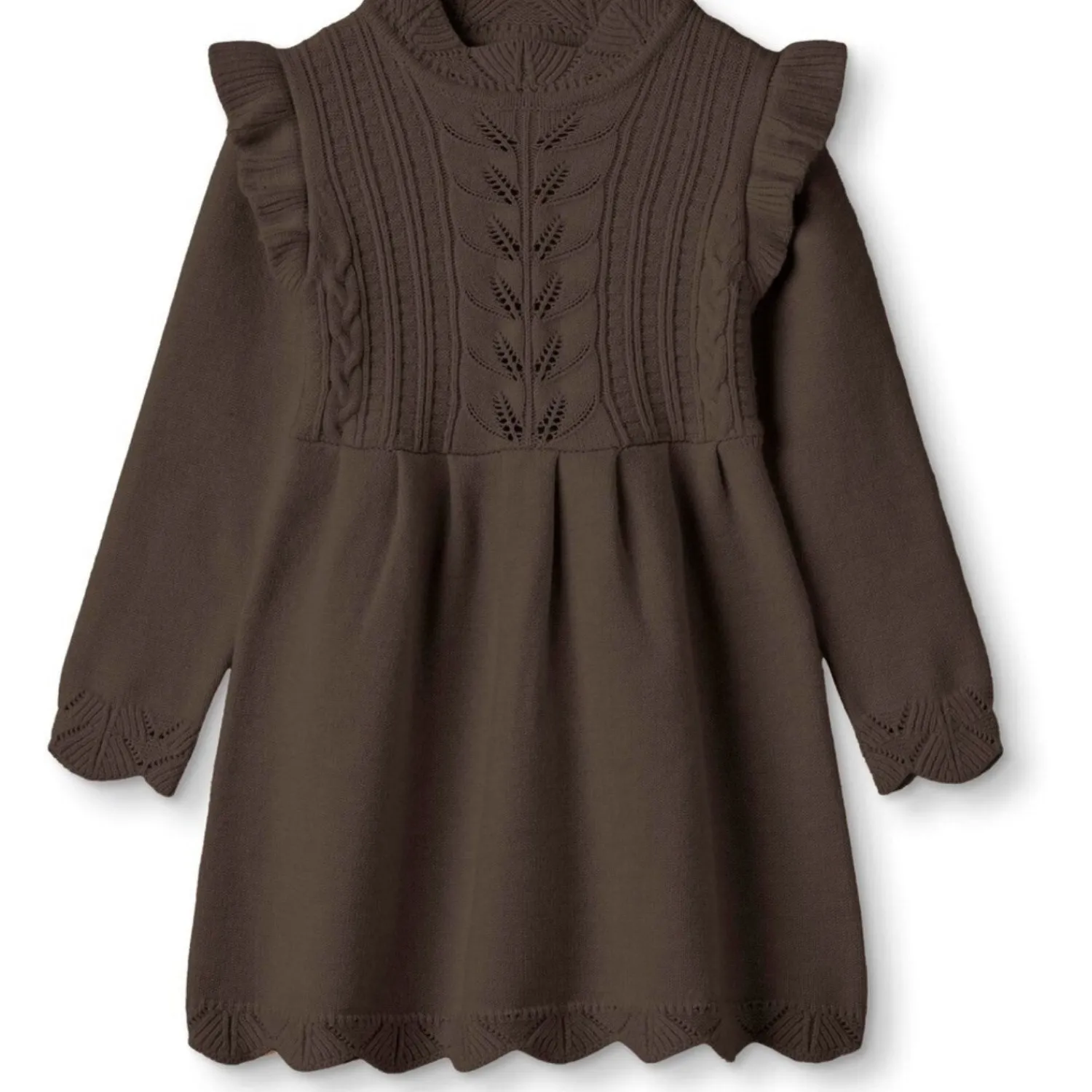 Denne charmerende strikkede kjole er lavet af en blød blanding bestående af 50% LENZING™ ECOVERO™ viskose, 27% nylon og 23% polyester. Kjolen er dekoreret med fine mønstrede detaljer foran samt på bunden og ærmerne. De elegante flæser på skuldrene tilføjer et sødt og chic touch, der passer perfekt til enhver lejlighed. Den ansvarlige fremstillingsproces af viskosen sikrer mindre miljøbelastning, hvilket gør denne kjole til et ideelt valg for miljøbevidste forældre. Let at vedligeholde, kan kjolen maskinvaskes ved 30 °C og kræver kun lav temperatur ved strygning.