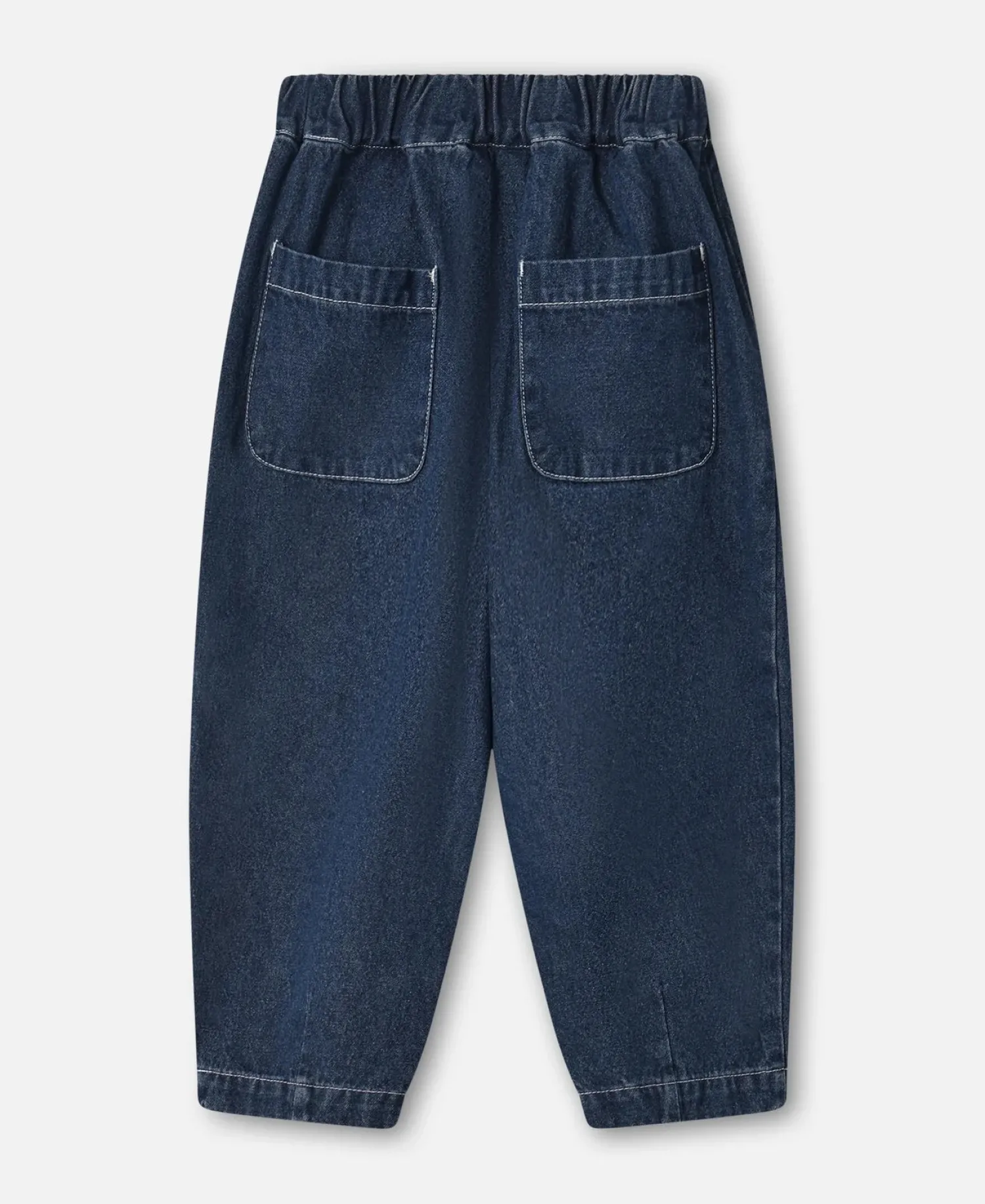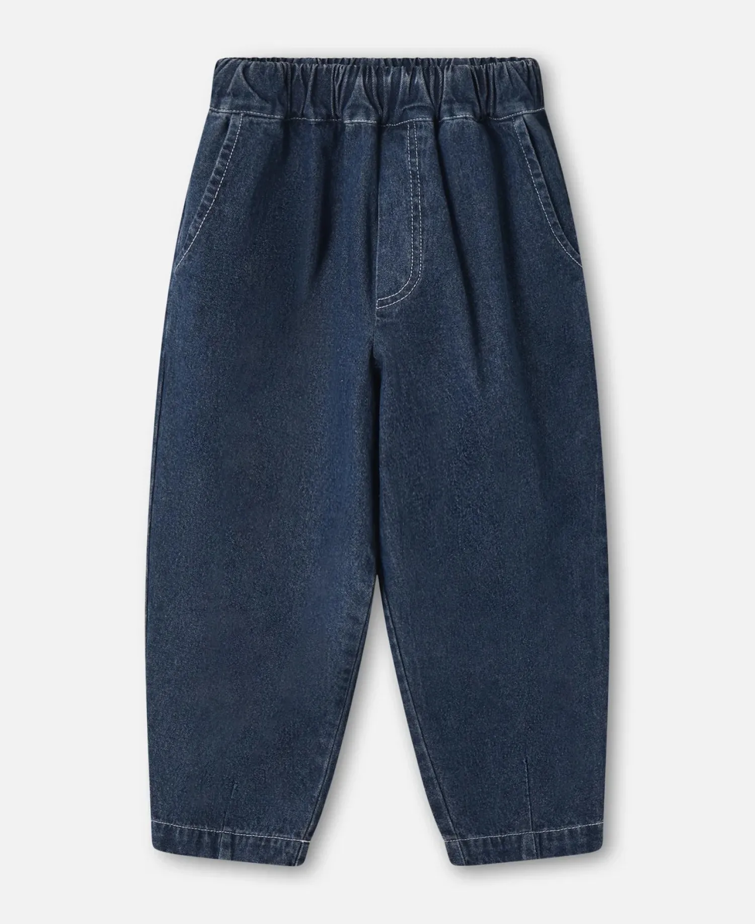 Lange denim bukser med elastik i taljen, lommer i sidesømmen til at gemme de spændende ting barnet finder på sin vej. Bukserne har meget volumen og et cigar snit hvilket gør dem behagelige at have på, men også nemme at lege i.