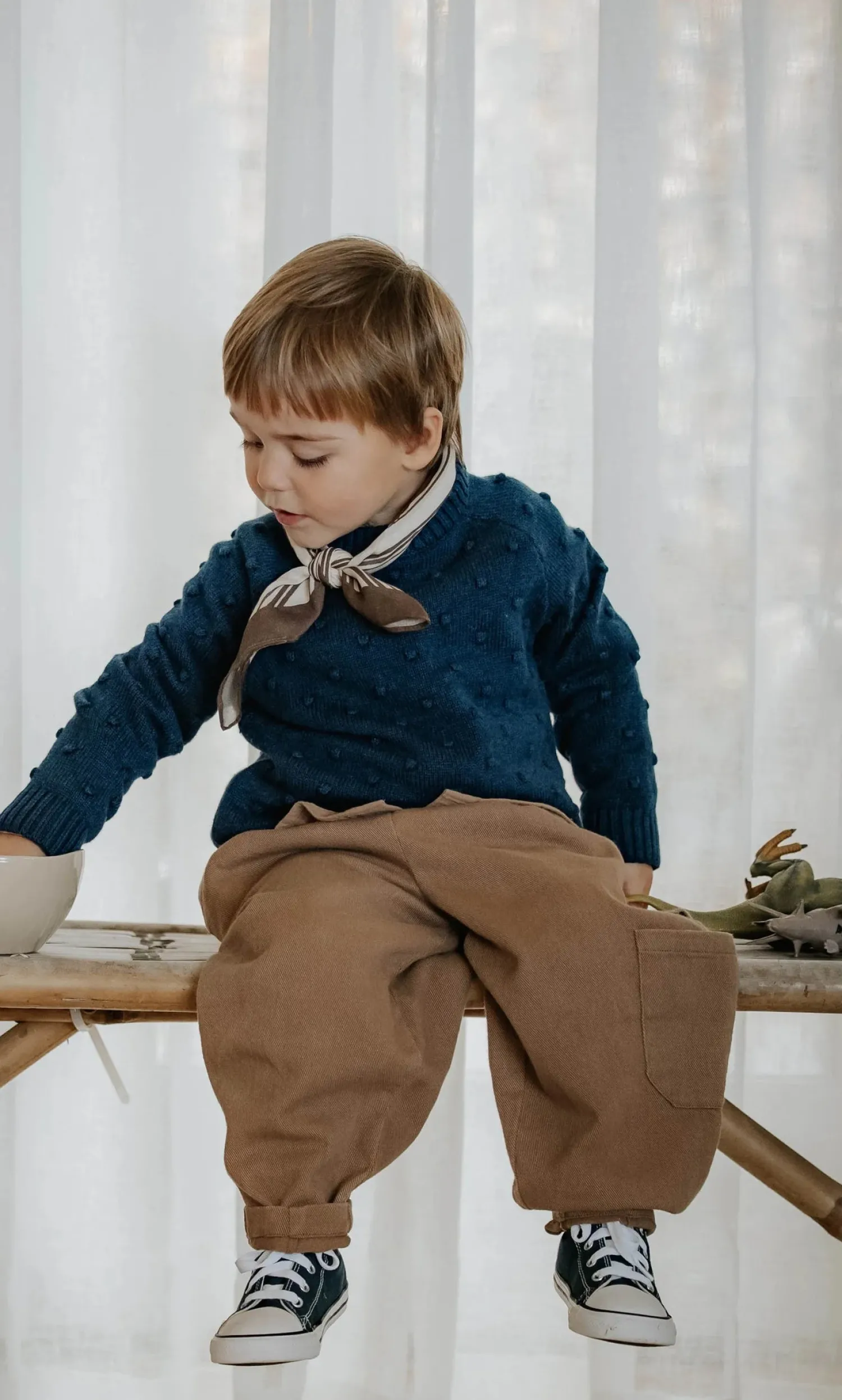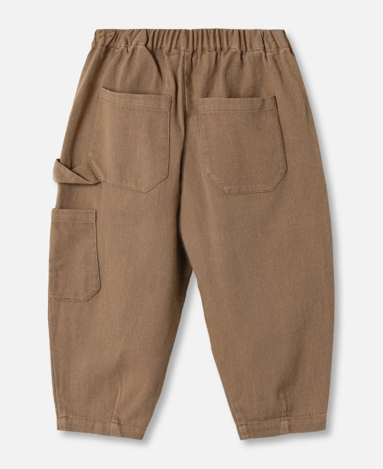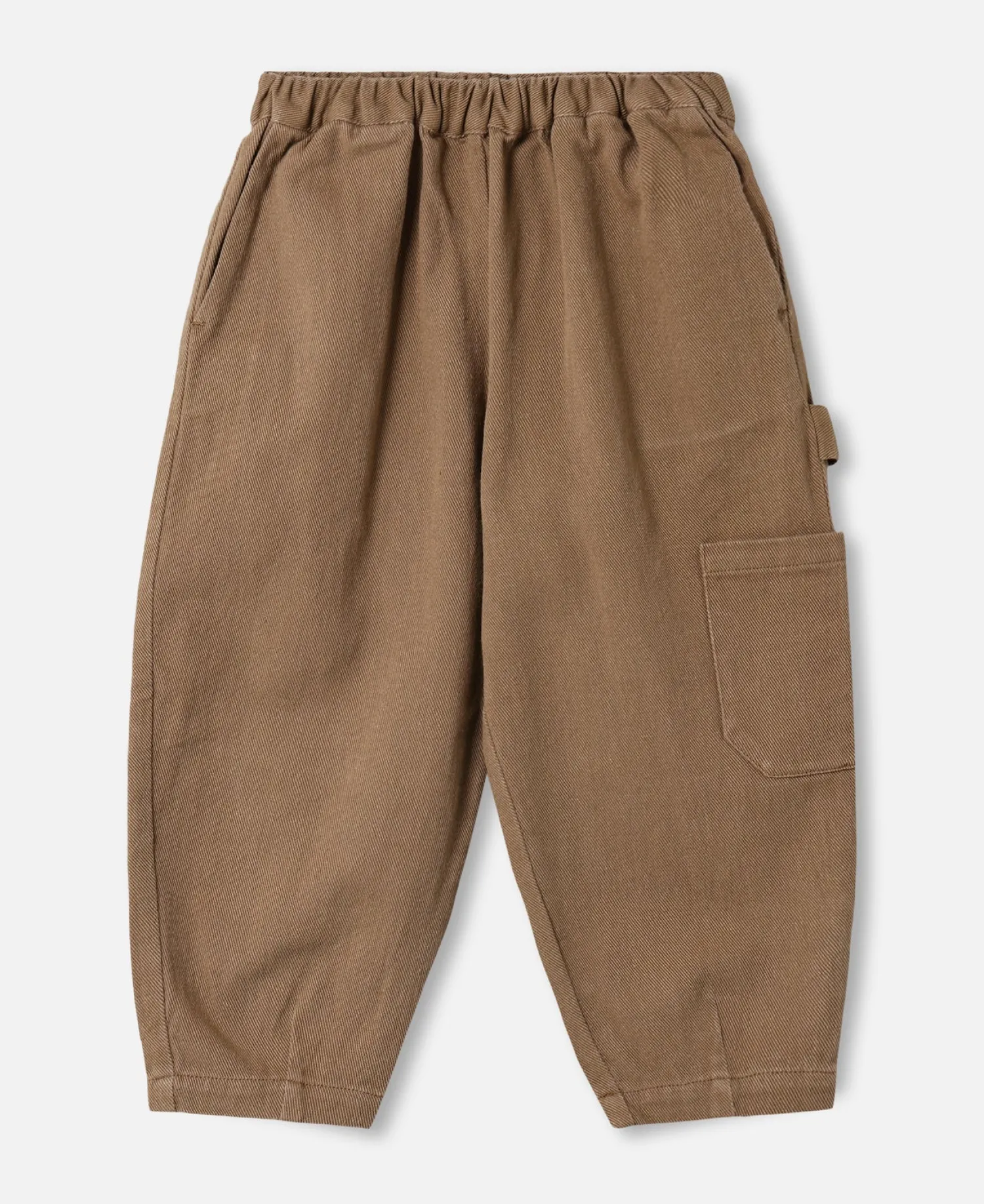 Lange denim bukser med elastik i taljen, lommer i sidesømmen og cargolomme på siden til at gemme de spændende ting barnet finder på sin vej. Bukserne er vasket som gør dem meget bløde at have på. Bukserne har meget volmen og et cigar snit hvilket gør dem behagelige at have på, men også nemme at lege i.