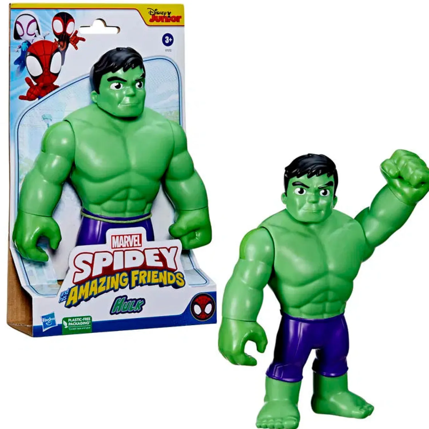 Det er Spidey-tid! Spidey and His Amazing Friends Supersized Hulk-actionfigur, lavet til børn med stor fantasi. Denne 22,5 cm høje superhelteactionfigur med bevægelige led er stor, venlig og klar til leg! Børn kan placere actionfigurens hoved og arme i sjove actionstillinger for at genskabe deres yndlingsscener fra Marvels animerede serie for førskolebørn på Disney Junior.