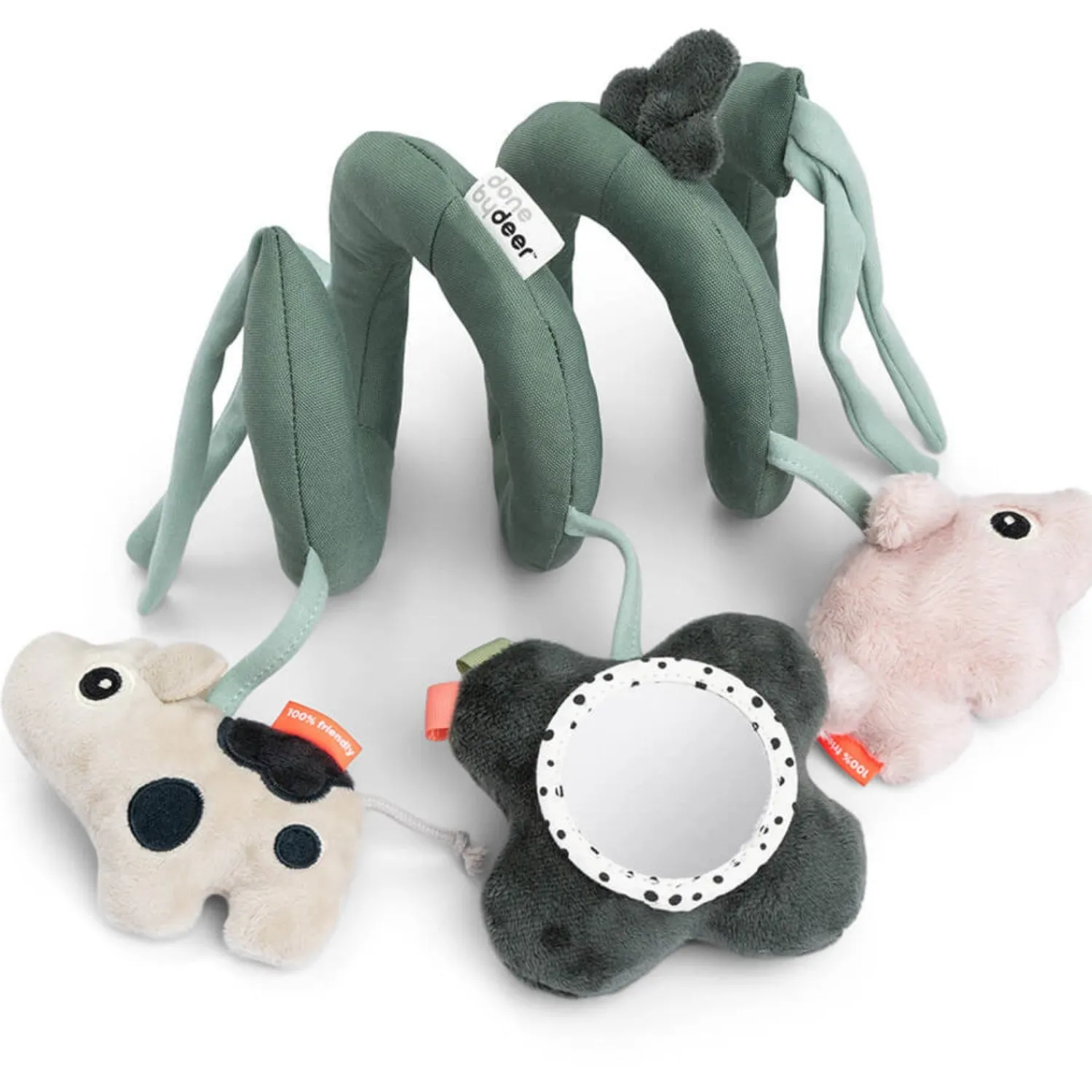 Med sensoriske elementer som en rangle, en klokke og knitren, stimuleres dit barns hørelse og taktile sanser. Lad din baby udforske sig selv og sine refleksioner i spejlet. Den lette spiral kan bindes på sengen, autostolen eller barnevognen og har en sej grøn farve med farverige detaljer og kontraster for visuel stimulering. Deer friends underholder dit barn, mens I er på farten.