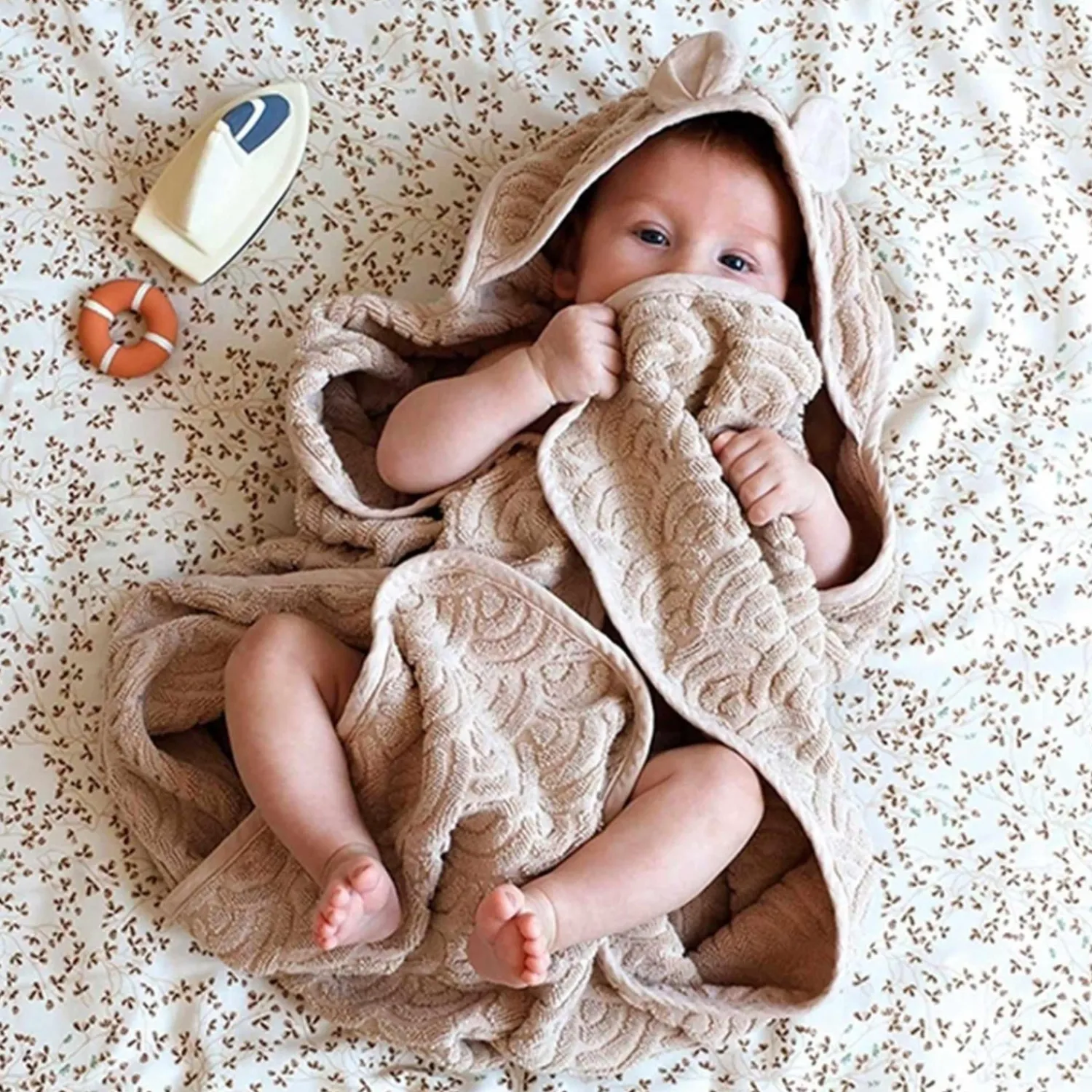Med dimensionerne 80×80 cm er dette håndklæde ideelt til at pakke din baby ind og holde dem varme og hyggelige. Det praktiske ombuk på hætten tilføjer en ekstra charme til designet og gør det endnu mere funktionelt.