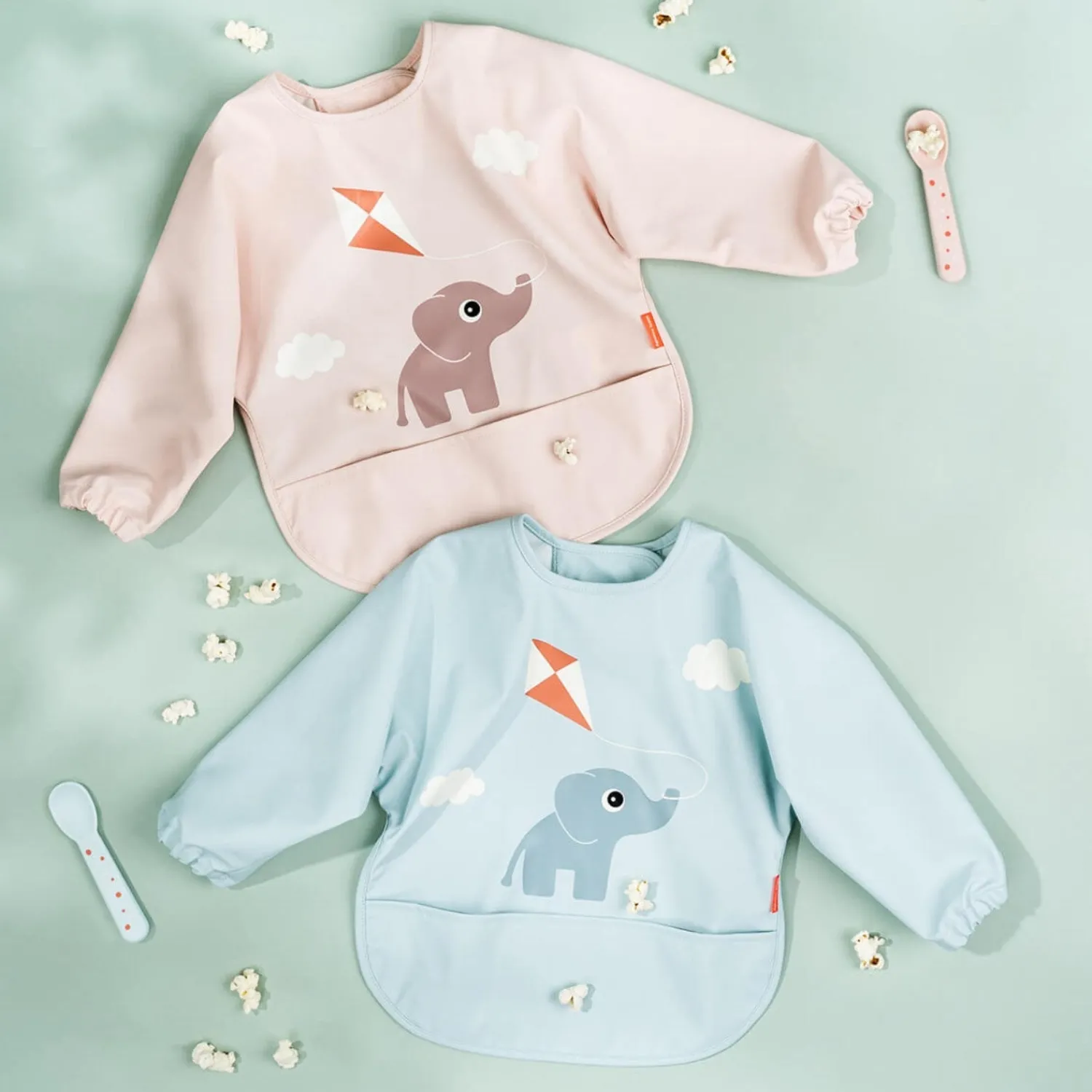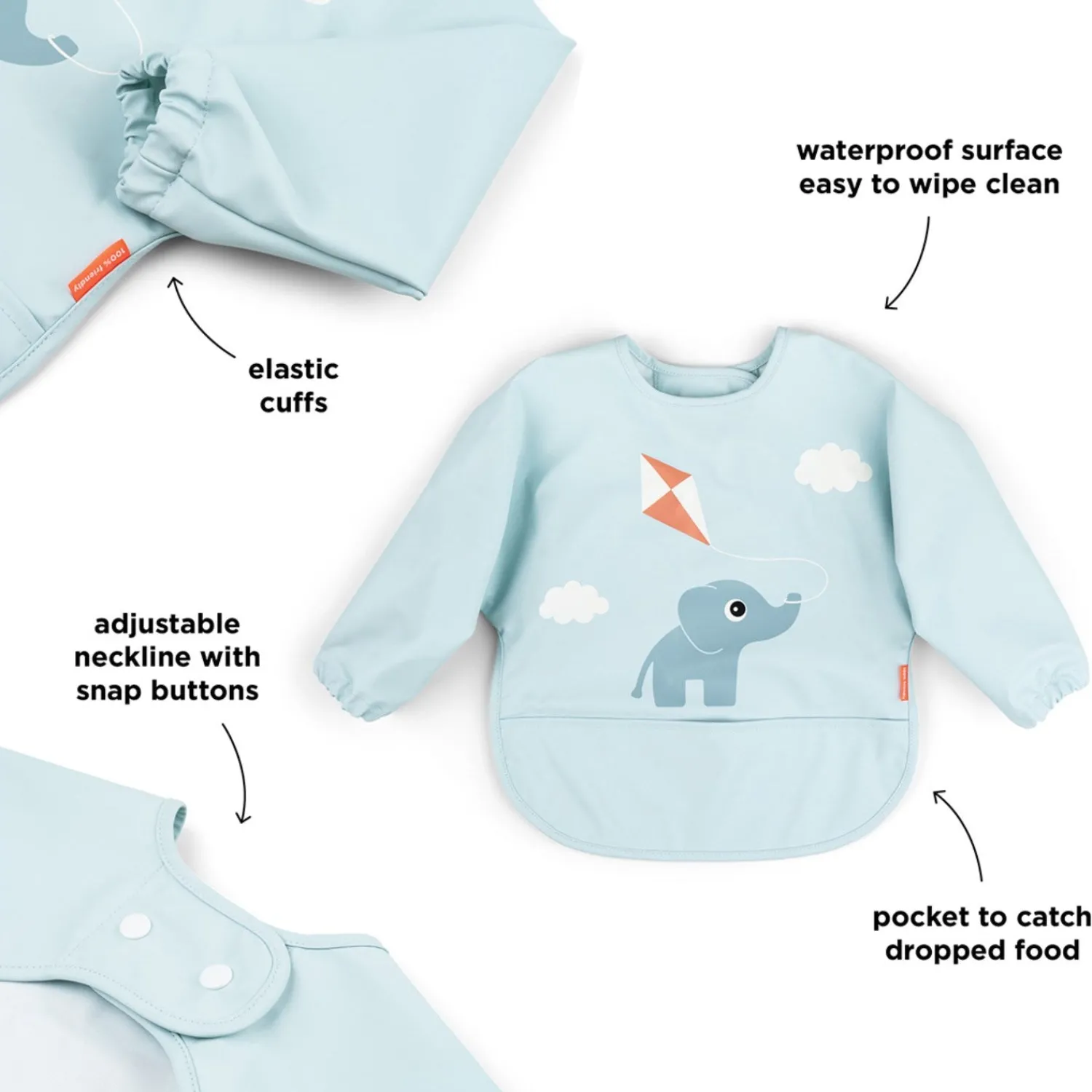 Hold tøjet rent og lad dit barn lege med stil med denne smarte hagesmæk fra Done by Deer. Den blå hagesmæk er dekoreret med et sødt Elphee-motiv, der flyver med en drage på Playground. Med en vandafvisende overflade, lange ærmer og en praktisk lomme til at opsamle tabt mad, er denne hagesmæk den ideelle løsning til måltidstid. Justerbar lukning med trykknapper gør det nemt at tilpasse efter behov. Lavet af 100% polyester med PU coating, måler hagesmækken 34 cm foran og ærmerne er 72 cm brede. Let at rengøre og perfekt til at beskytte dit barns tøj.