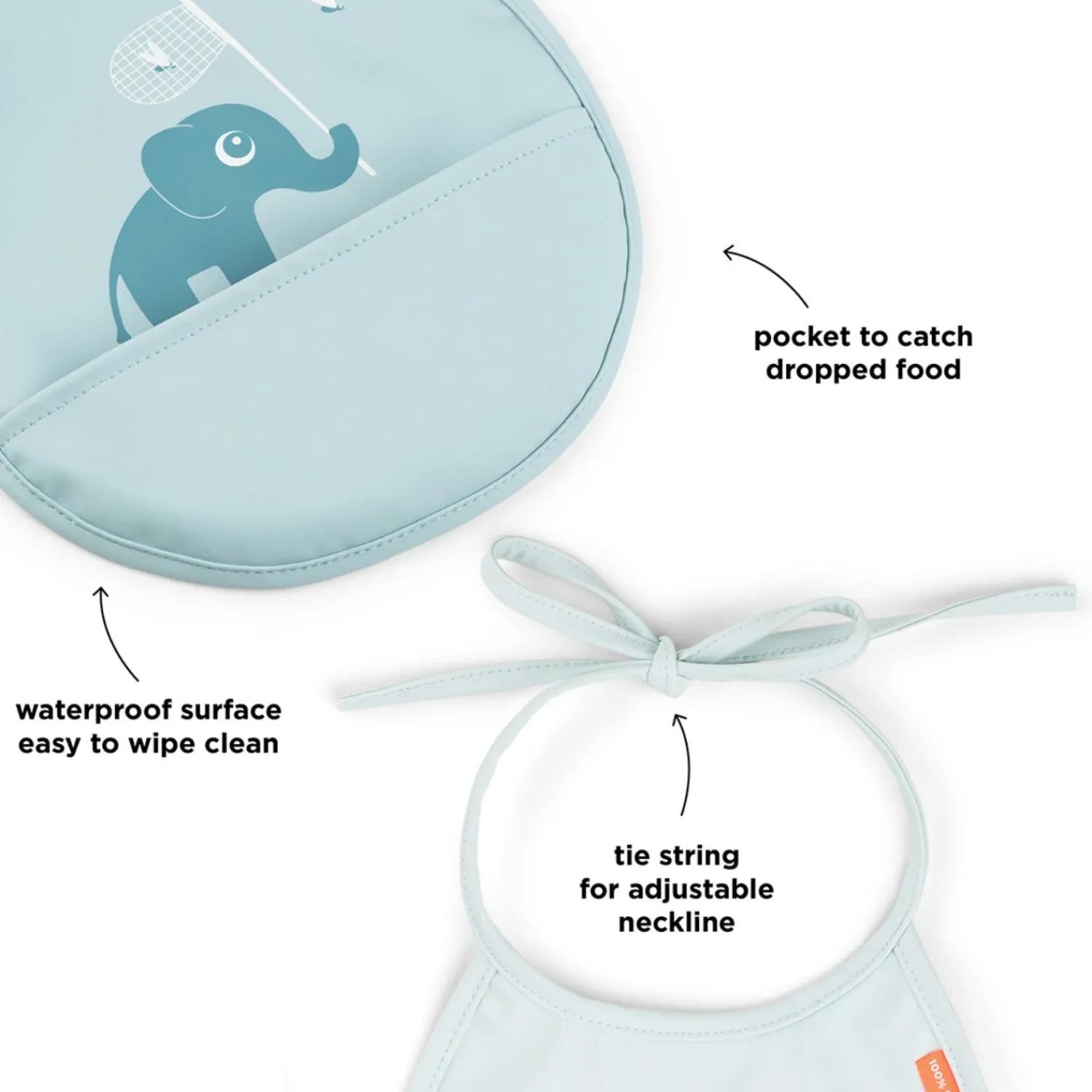 Den praktiske lomme på hagesmækken fanger spildt mad, mens bindebåndene gør det nemt at tage hagesmækken af og på. Lavet af 100% polyester med PU coating og med en størrelse på 20 x 19,5 cm, er disse hagesmække både funktionelle og stilfulde.