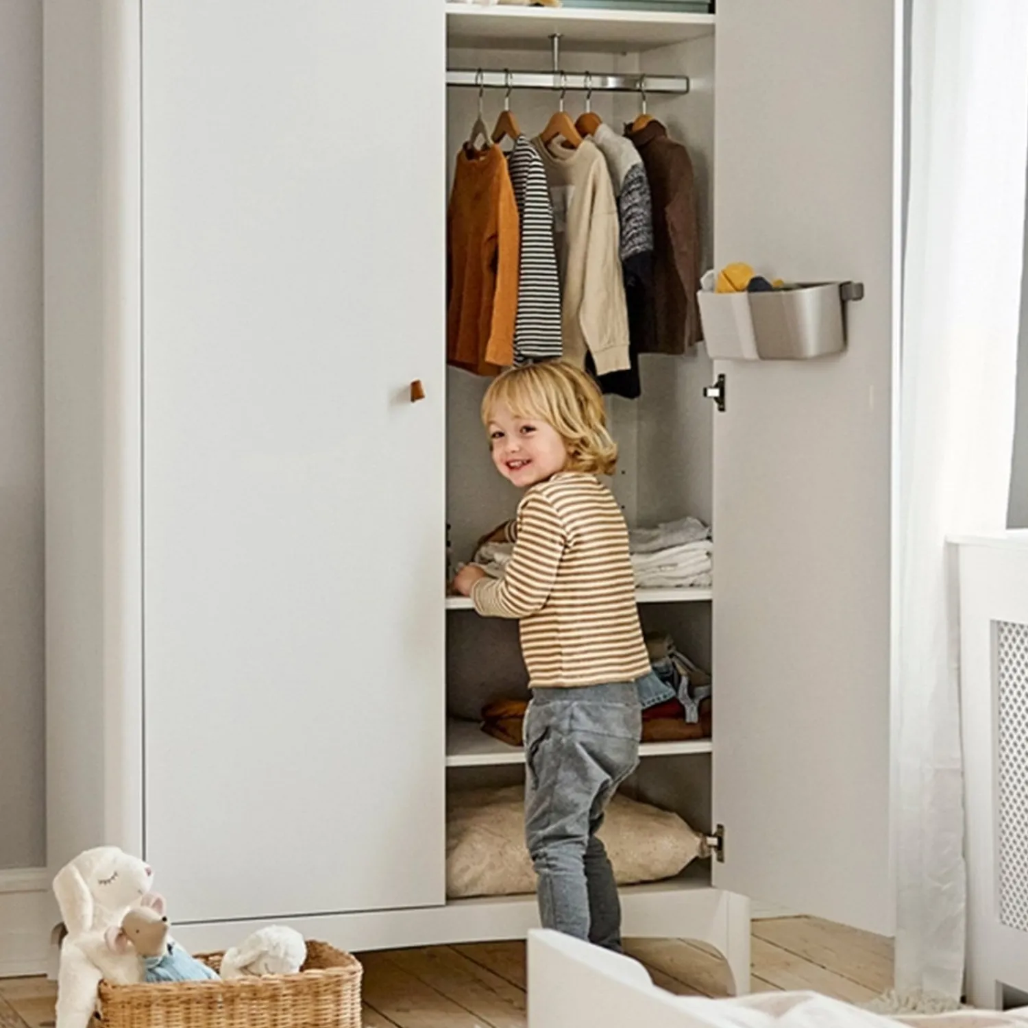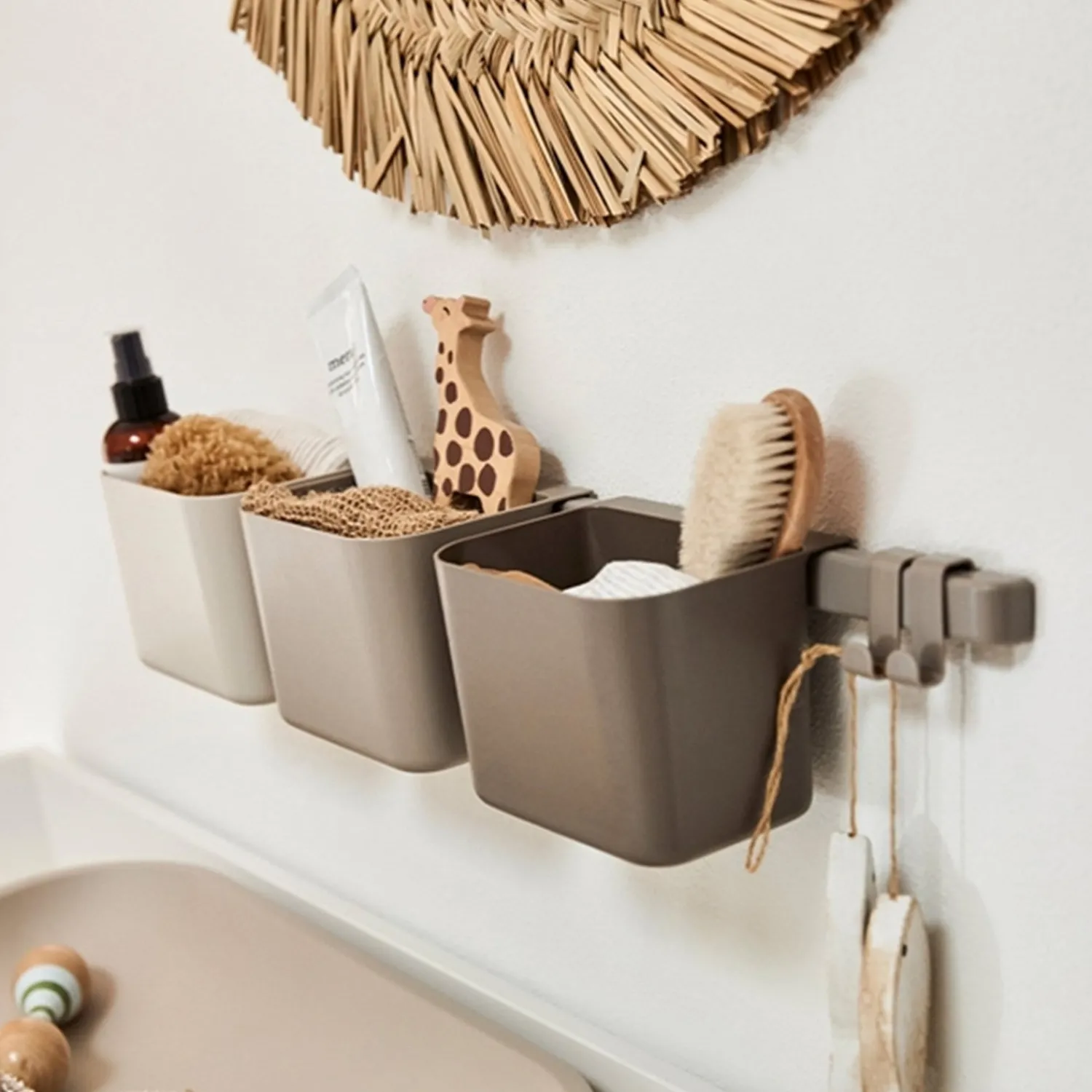 Med 3 aftagelige opbevaringsholdere og 4 kroge, kan du nemt organisere og optimere pladsen på børneværelset. Disse bokse kan også bruges på Leander Linea™ puslebordet samt på pusleenhederne i Leander Classic™, Luna™ og Linea™ serierne. Fremstillet af holdbart ABS-plast og aluminiumsstang, er de nemme at rengøre og tåler opvaskemaskine.