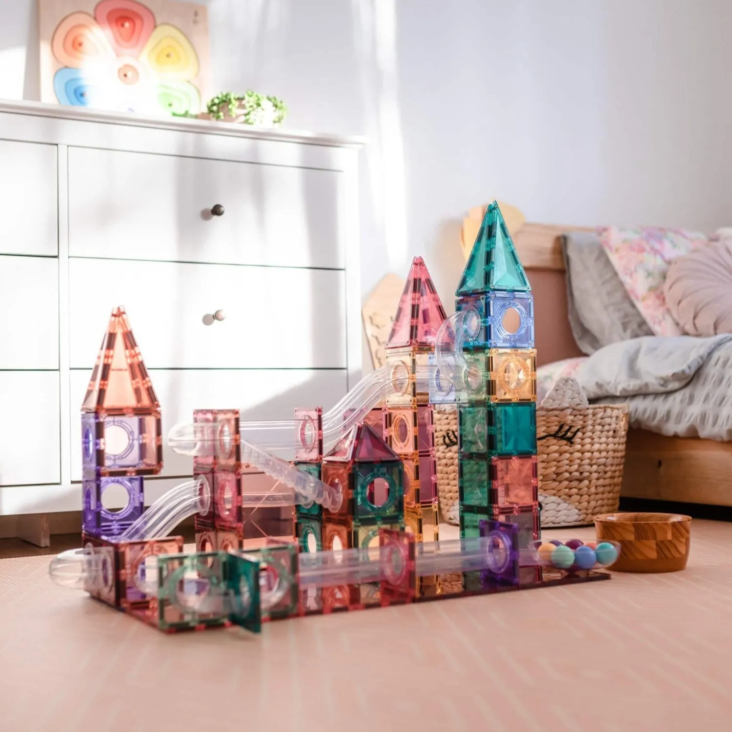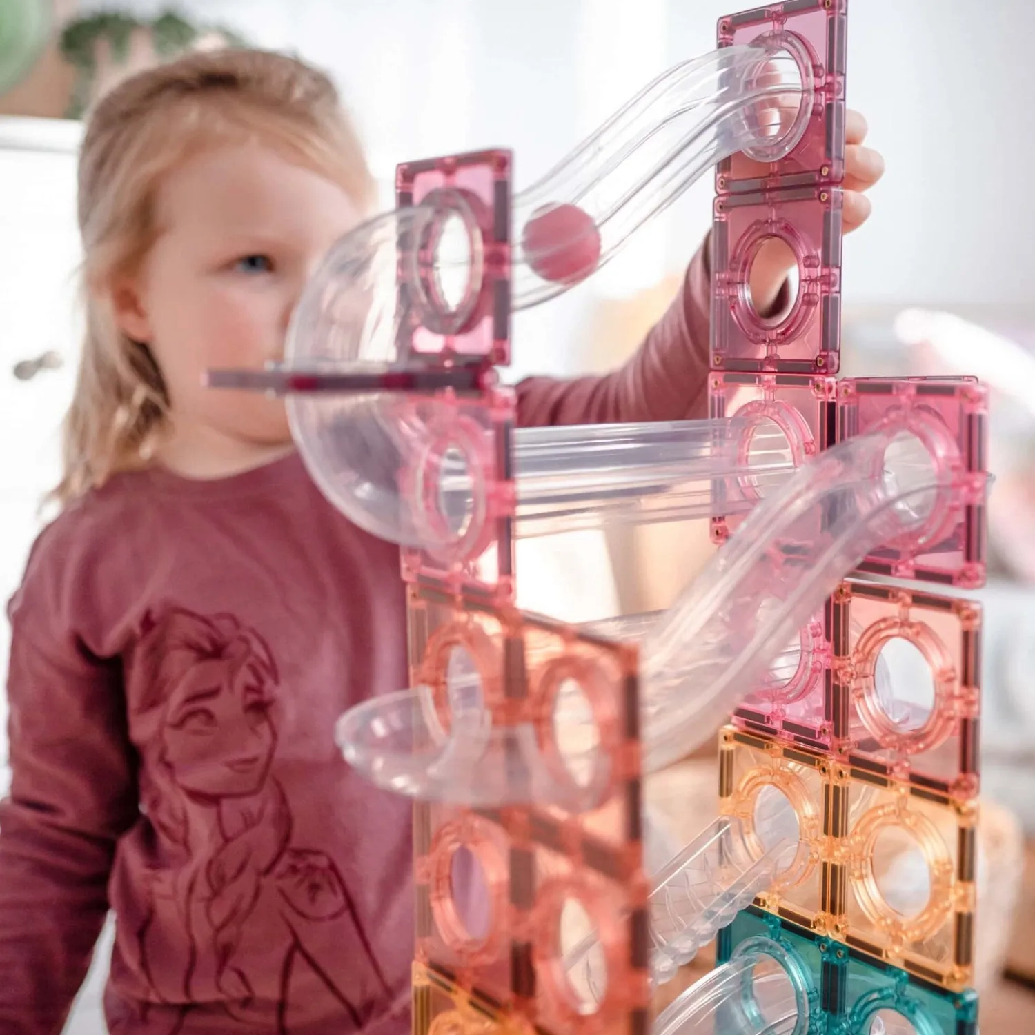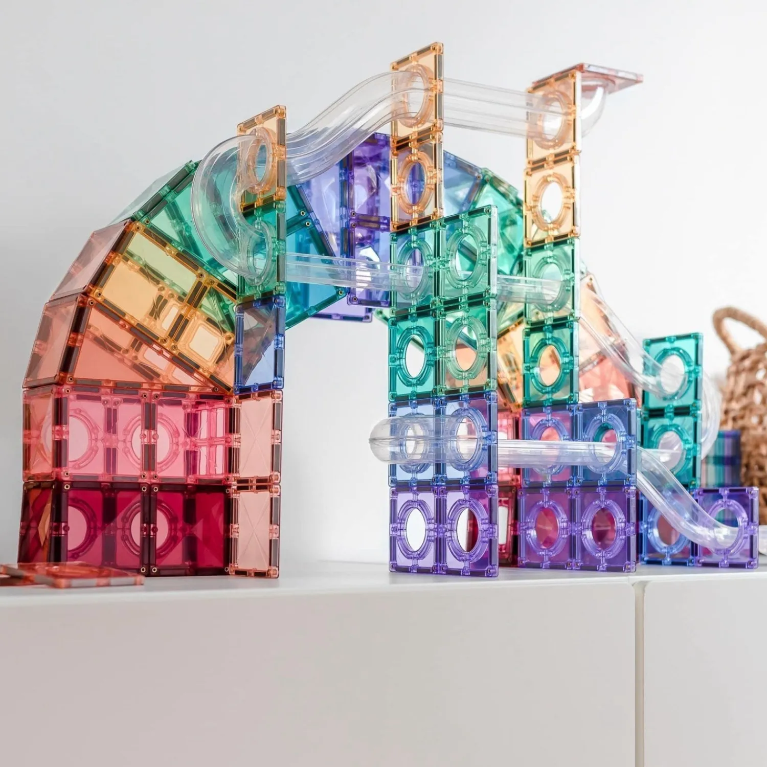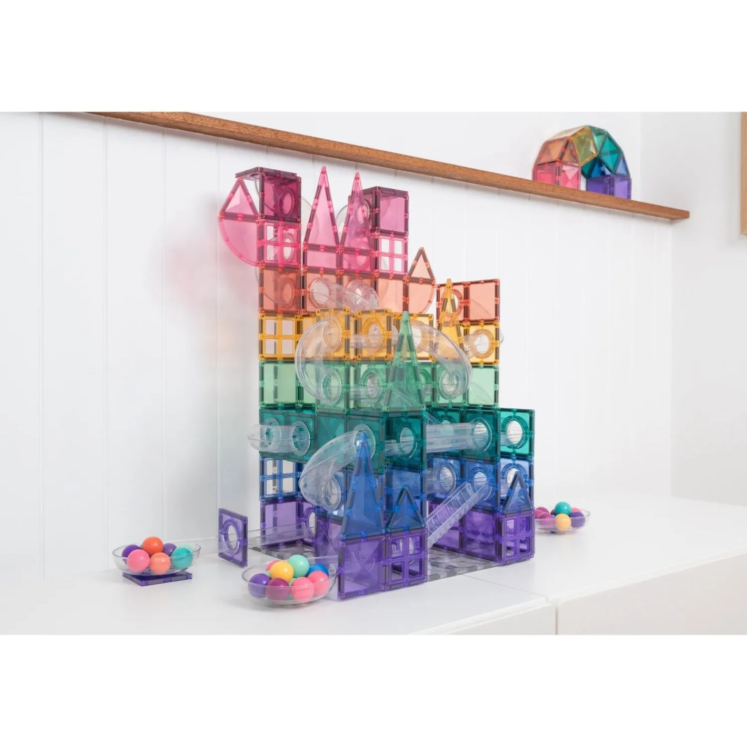 Dette sæt inkluderer alt, hvad dit barn har brug for til at skabe spændende boldbaner, herunder boldløb firkanter, bolde, splitrør, trapper, bøjningsrør, gliderør og meget mere. Lad legen begynde, og se dit barn udfolde deres kreativitet med Connetix Pastel Bold Run Pak 106 Styks.