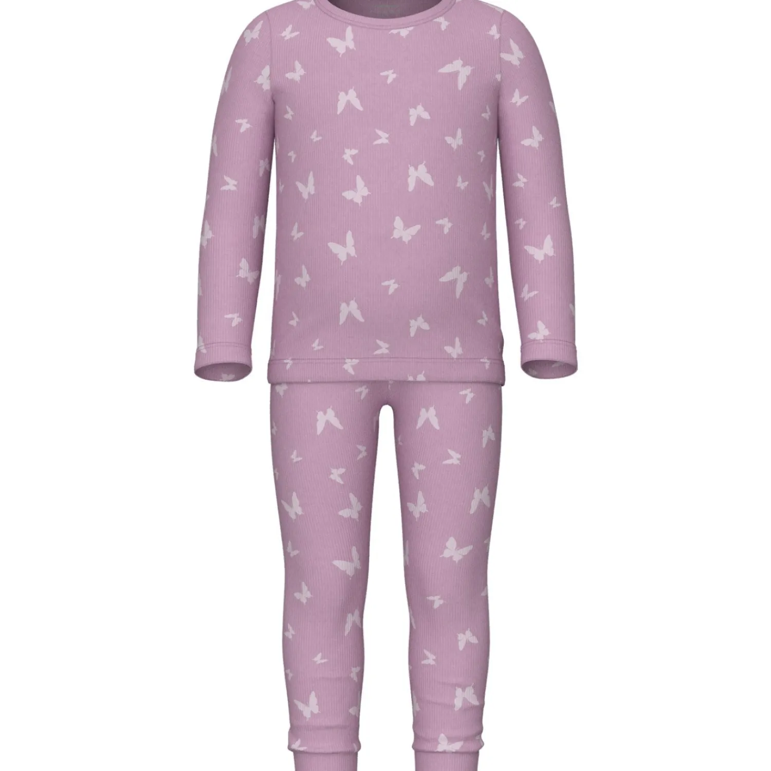 Forkæl dit barn med disse Name It Pink Lavender pyjamas og gør sengetid til en hyggelig oplevelse. Designet i blødt ribstrikket materiale med en elastisk talje og lange ærmer, sikrer dette natsæt en behagelig pasform hele natten. Det charmerende pink butterfly-mønster vil glæde enhver lille drømmer og gøre pyjamasen til det perfekte valg til afslappede hjemmedage eller en god nats søvn.