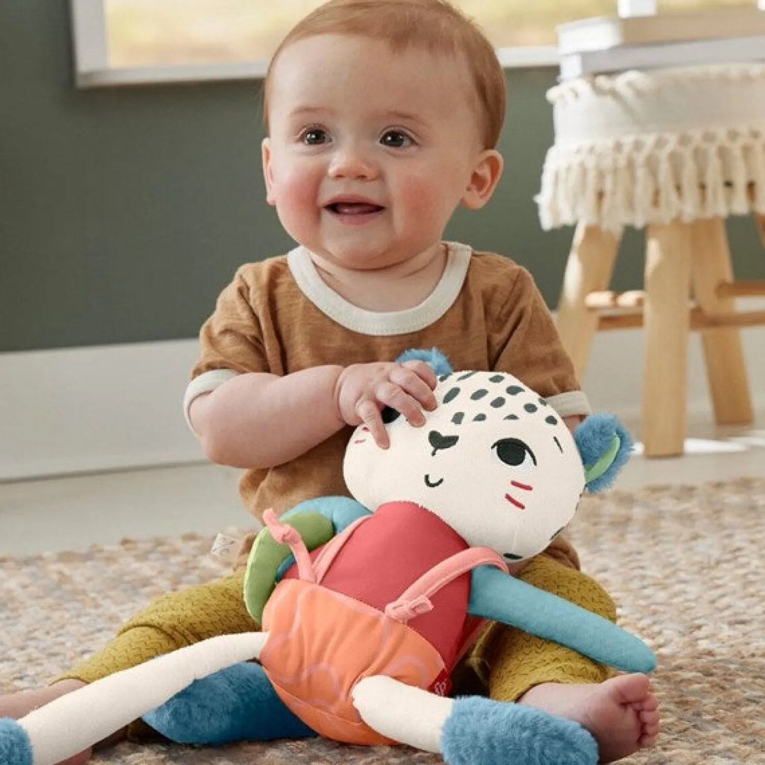 Holdbar og nem at vedligeholde, er dette legetøj det perfekte valg for travle forældre. Lad dit barn udforske de forskellige aktiviteter, som sneleoparden tilbyder, herunder træk i ben, en strop der kan trækkes af, og en blød glidering på armen.