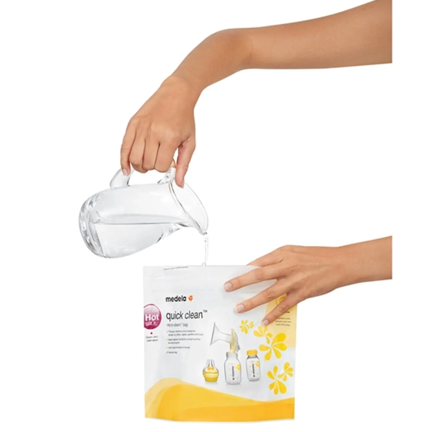 Medela Quick Clean Poser til Mikroovn er den ideelle løsning til nem og sikker sterilisering af brystpumper og tilbehør. Disse certificerede poser tilbyder en sikker og pålidelig dampbehandling, der fjerner 99,9 % af almindelige bakterier og smitstoffer på få minutter.