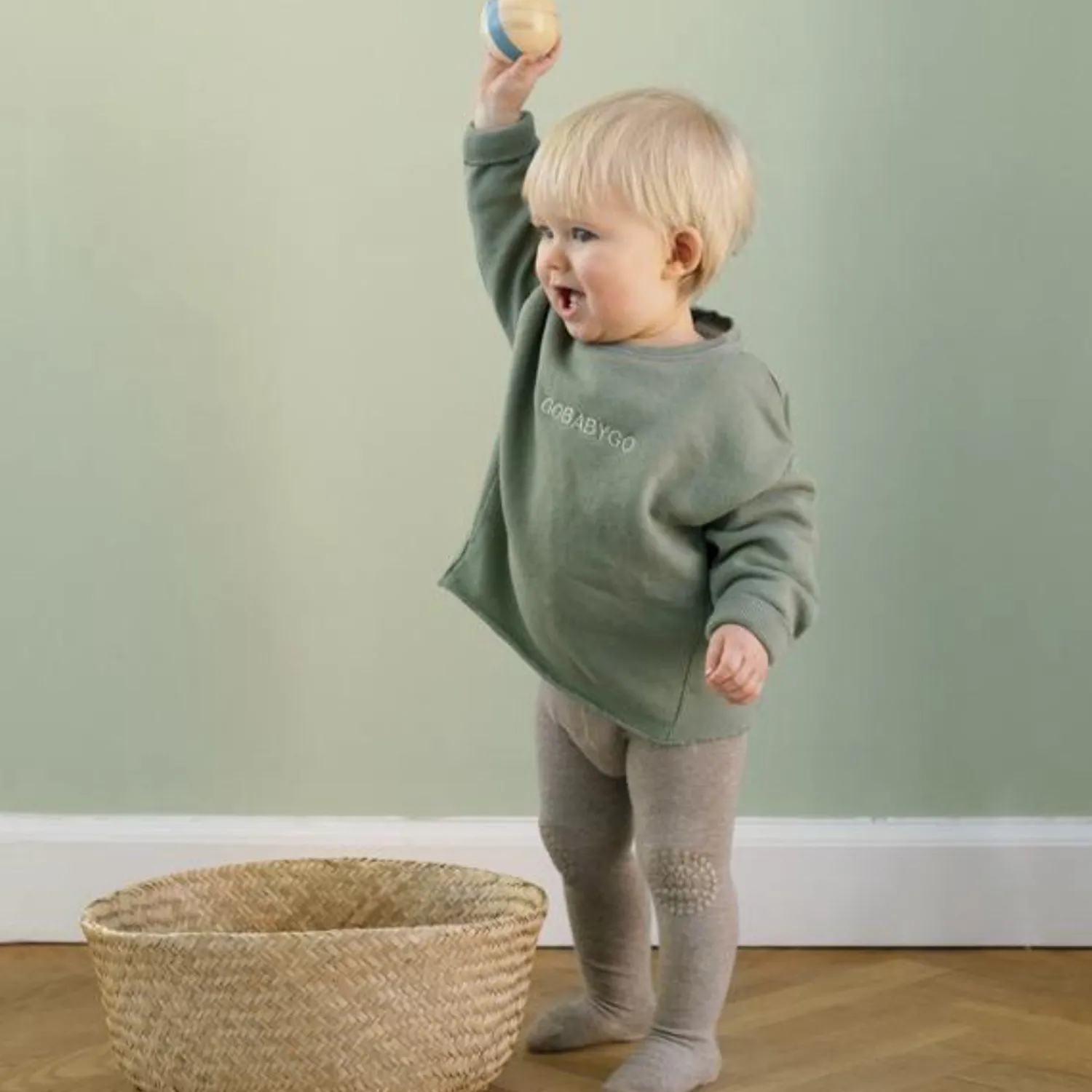 GoBabyGo Sand Crawling Strømpebukser i økologisk bomuld er den perfekte løsning til dit barns første kravle- og gåforsøg. Med skridsikre gummipuder på knæene, under fødderne og på tæerne forhindres glidning på glatte overflader. Fremstillet af blødt og strækbart økologisk bomuld, sikrer de en behagelig pasform med en bred ribkant, der understøtter barnets bevægelsesfrihed. Disse tights er designet i Danmark og produceret i Europa, hvilket gør dem til et sikkert valg, certificeret efter Oeko-Tex Standard 100. Styrk dit barns motorik og balance med GoBabyGo Sand Crawling Strømpebukser.