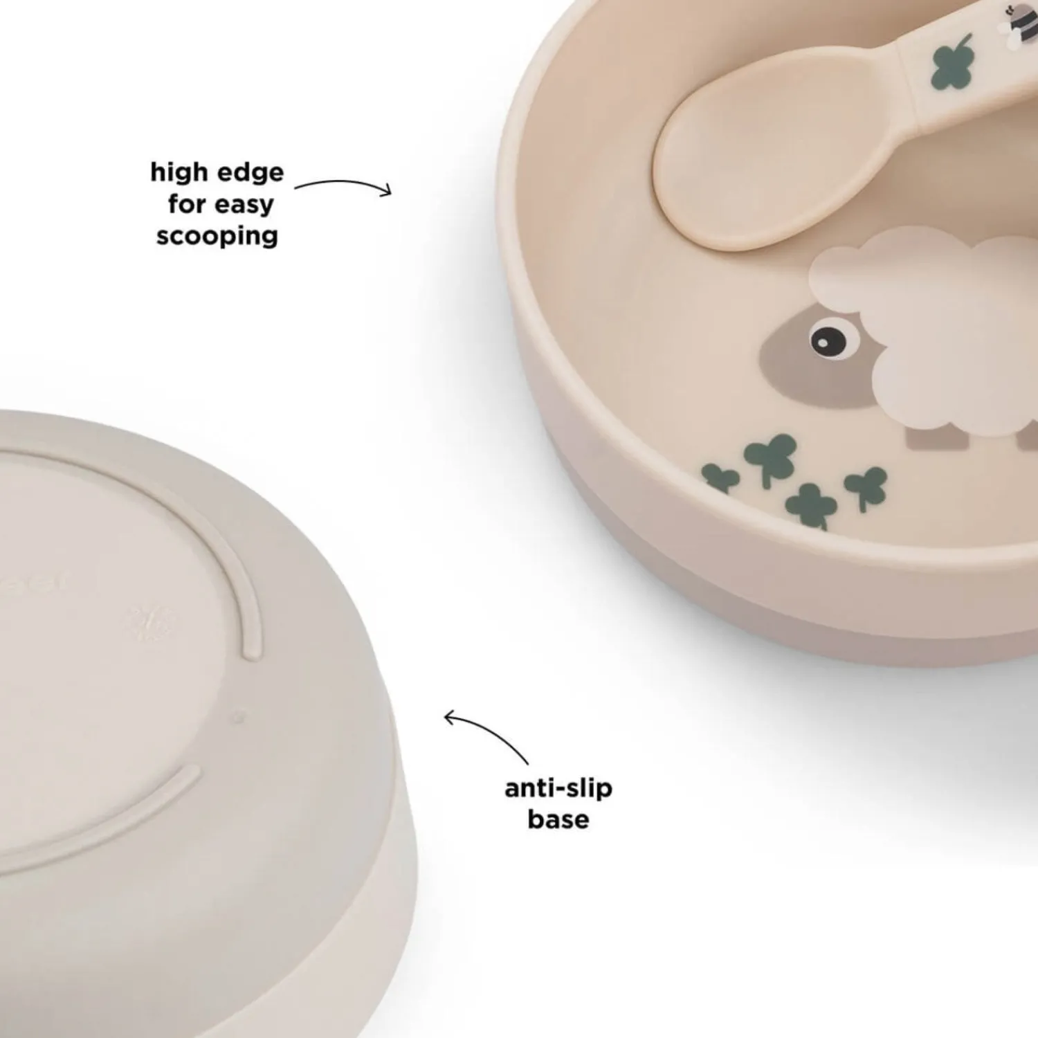 Skålen er lavet af fødevaregodkendt PP, der er frit for skadelige stoffer som BPA. Den har en praktisk antiskrid-base, en høj kant der hjælper børn med at spise, og den kan nemt rengøres i opvaskemaskinen. Med en fin sandfarve og motivet af Sheepy vil denne skål inspirere dit barn til at udforske madens verden på en sjov måde.