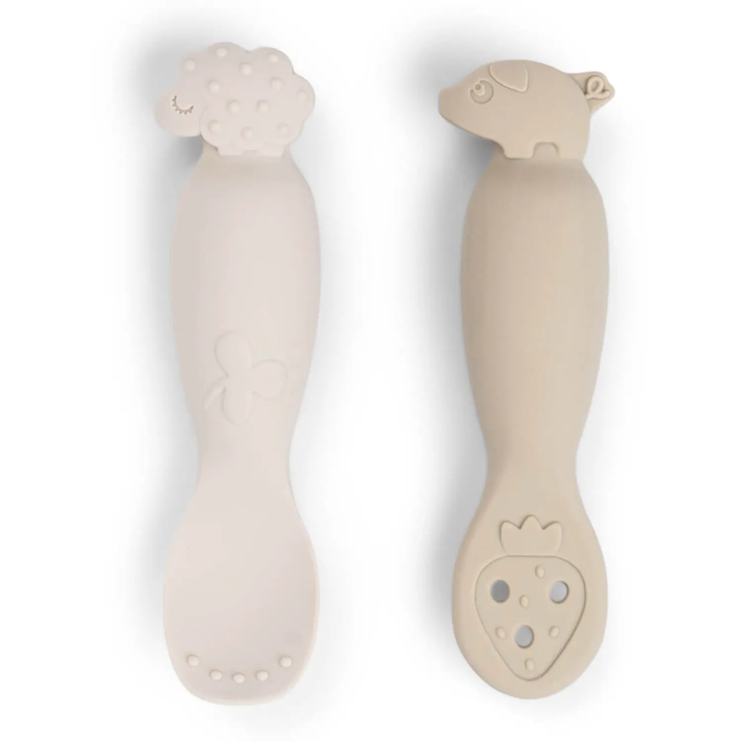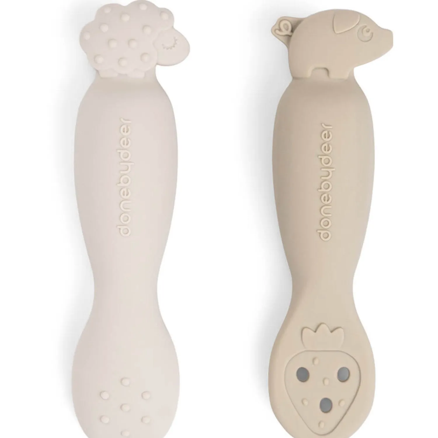 Med bløde skeer, der er perfekte til at udforske mad i eget tempo, stimulerer dette sæt barnets motoriske færdigheder ved hvert måltid. De charmerende Pigee- og Sheepy-figurer og fine sandfarver tilføjer en sjov og underholdende dimension til spisetid, mens de former og teksturer gør det nemt for små hænder at håndtere skeerne.