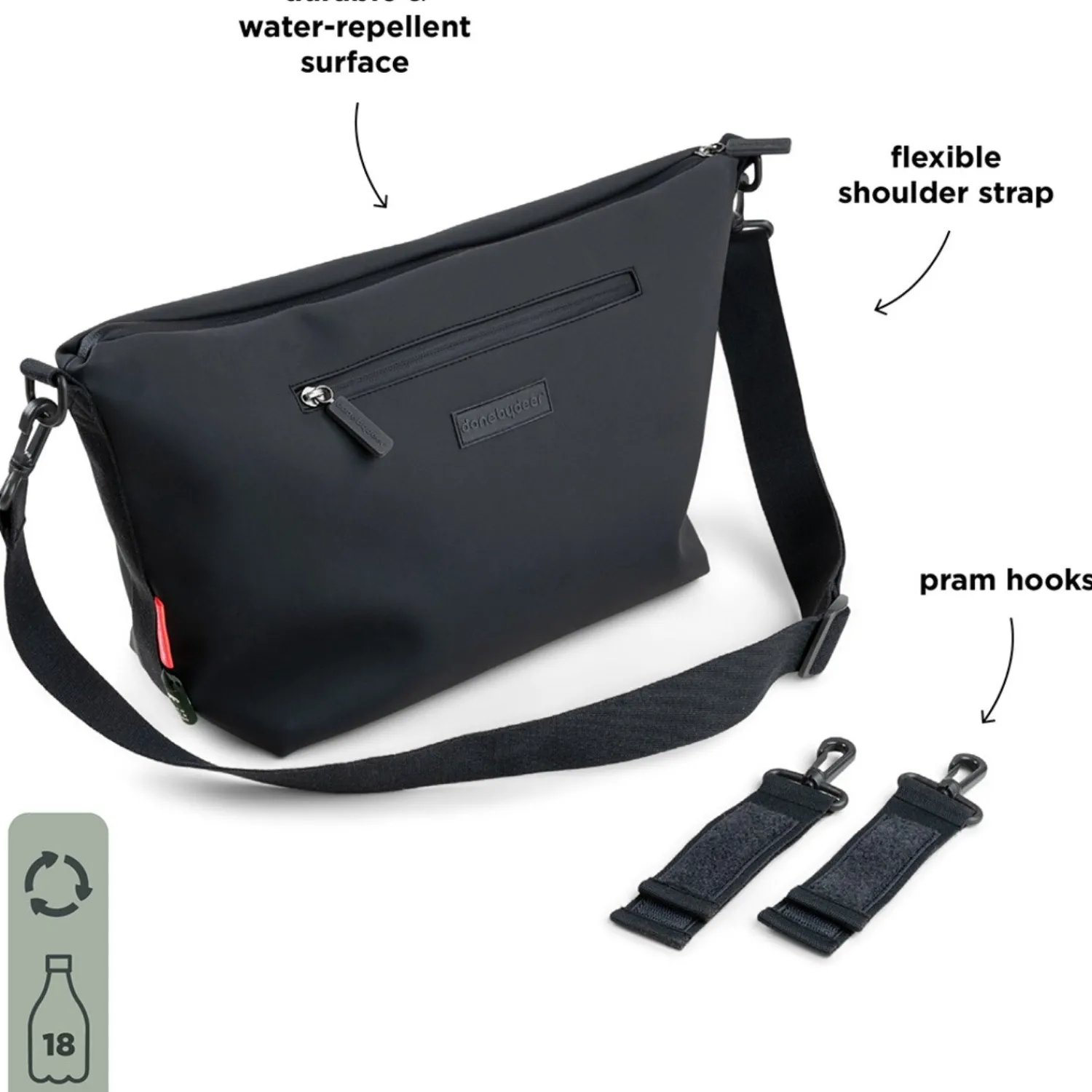 Tag din stil og babys nødvendigheder med på farten med DonebyDeer sort barnevognstaske. Denne taske er perfekt til travle forældre, som vil have alt inden for rækkevidde. Med praktiske barnevognsstropper kan den nemt sættes på barnevognens håndtag, mens det store hovedrum og de smarte lommer holder styr på alt fra sutteflasker til snacks.