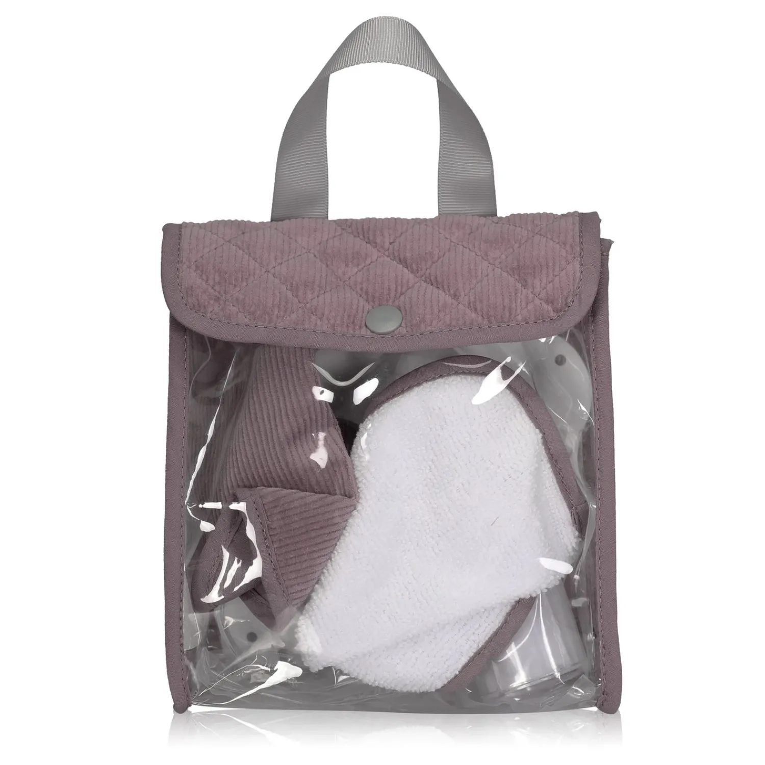 Den lukkes nemt med en trykknap, er gennemsigtig på den ene side, så man nemt kan se, hvad man har pakket og har en lille hank i toppen, der gør den super nem at transportere og dermed perfekt til turen.