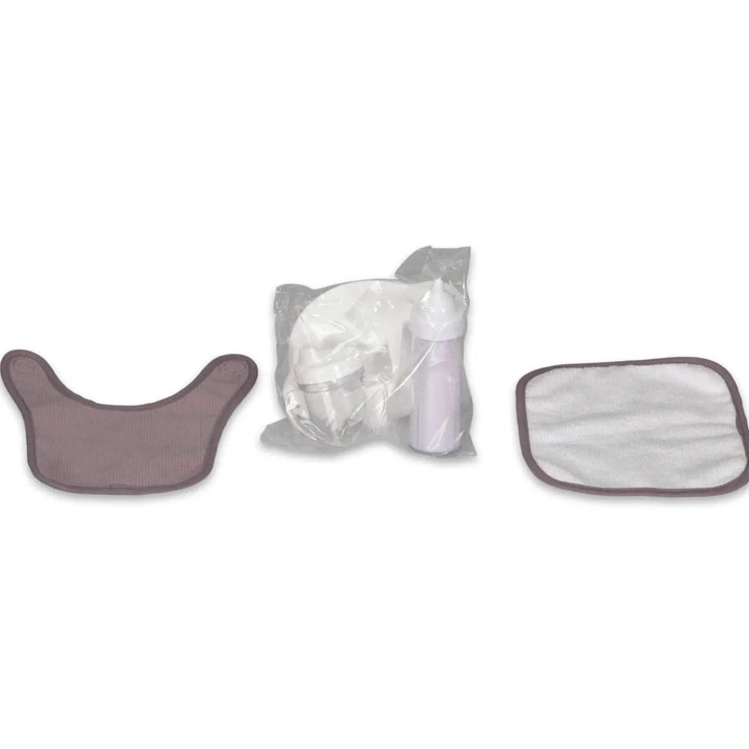 Sættet består af i alt 7 dele: hagesmæk, vaskeklud, sutteflaske med imiteret mælk, drikkekop med tud, gaffel, ske og ruminddelt tallerken.