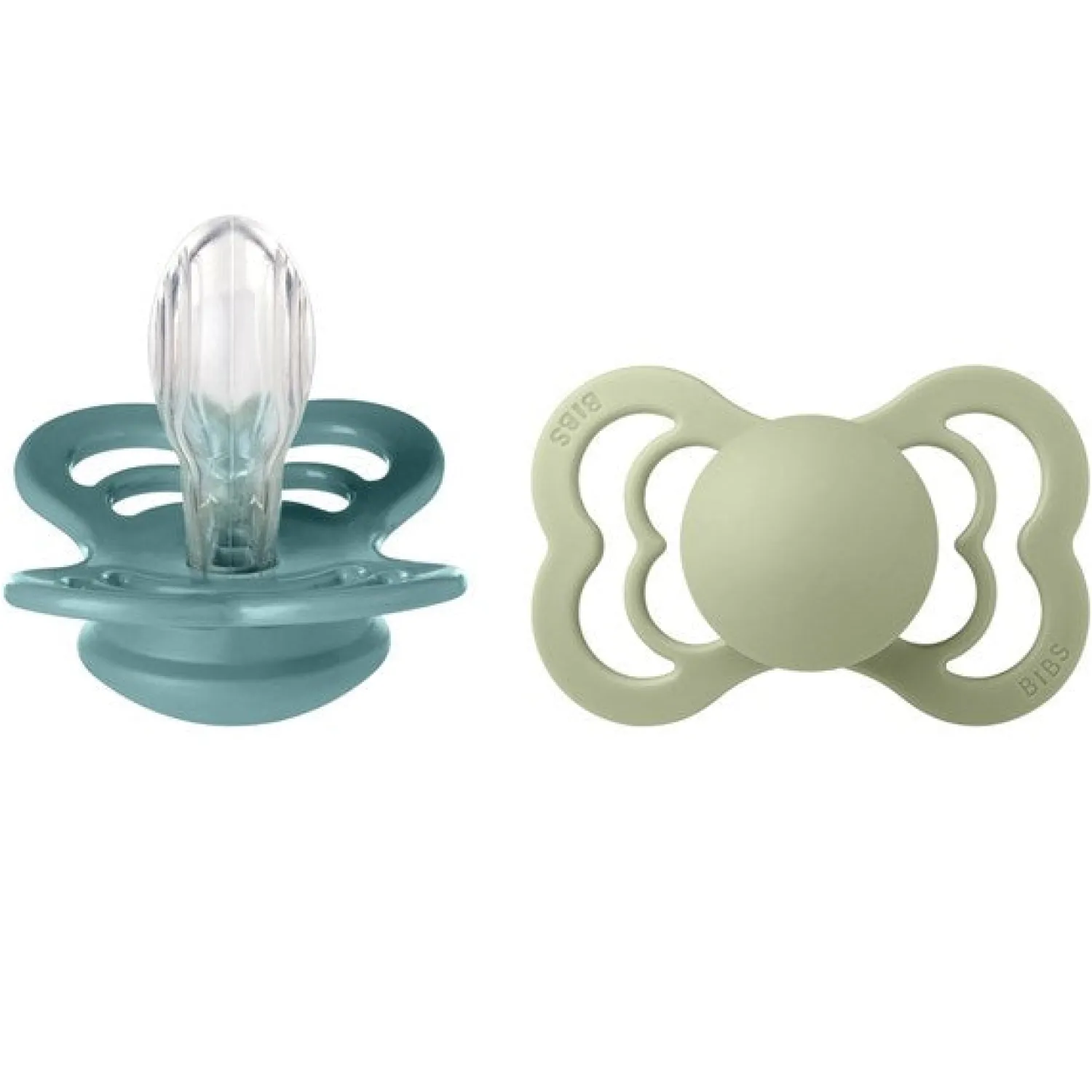 Opdag Bibs Supreme Silikone Sutter i en fortryllende kombination af Island Sea og Sage farver. Disse sutter er skabt med fokus på at fremme en sund udvikling af dit barns kæbe og reducere trykket på tænderne. Det luftige skjold design skåner den sarte hud omkring munden og sikrer behagelig brug.