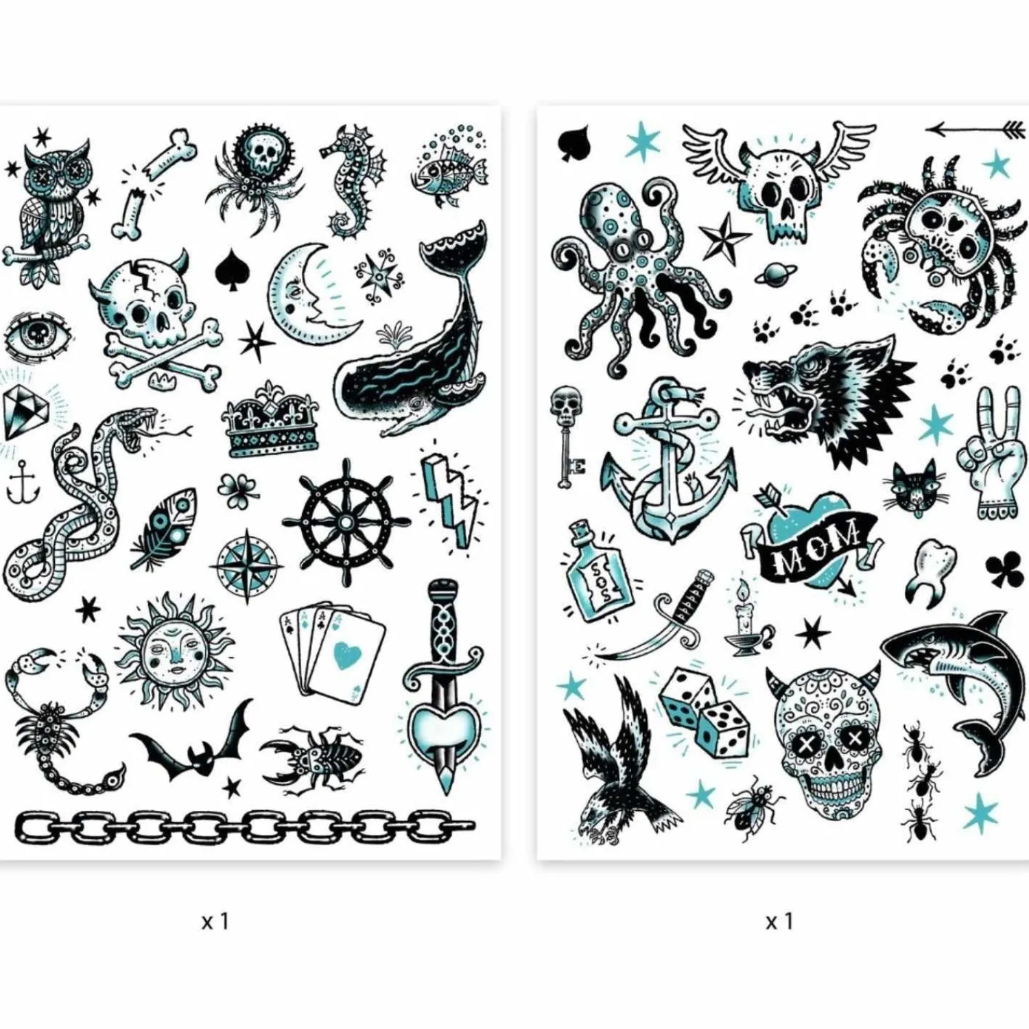 Opdag den spændende verden af midlertidige tatoveringer med Djeco Tattoo Dark Side. Denne pakke indeholder to ark med iøjnefaldende sort og blå designs, der vil pynte ethvert barns hud og lade dem udforske deres kreative side på en sjov måde.