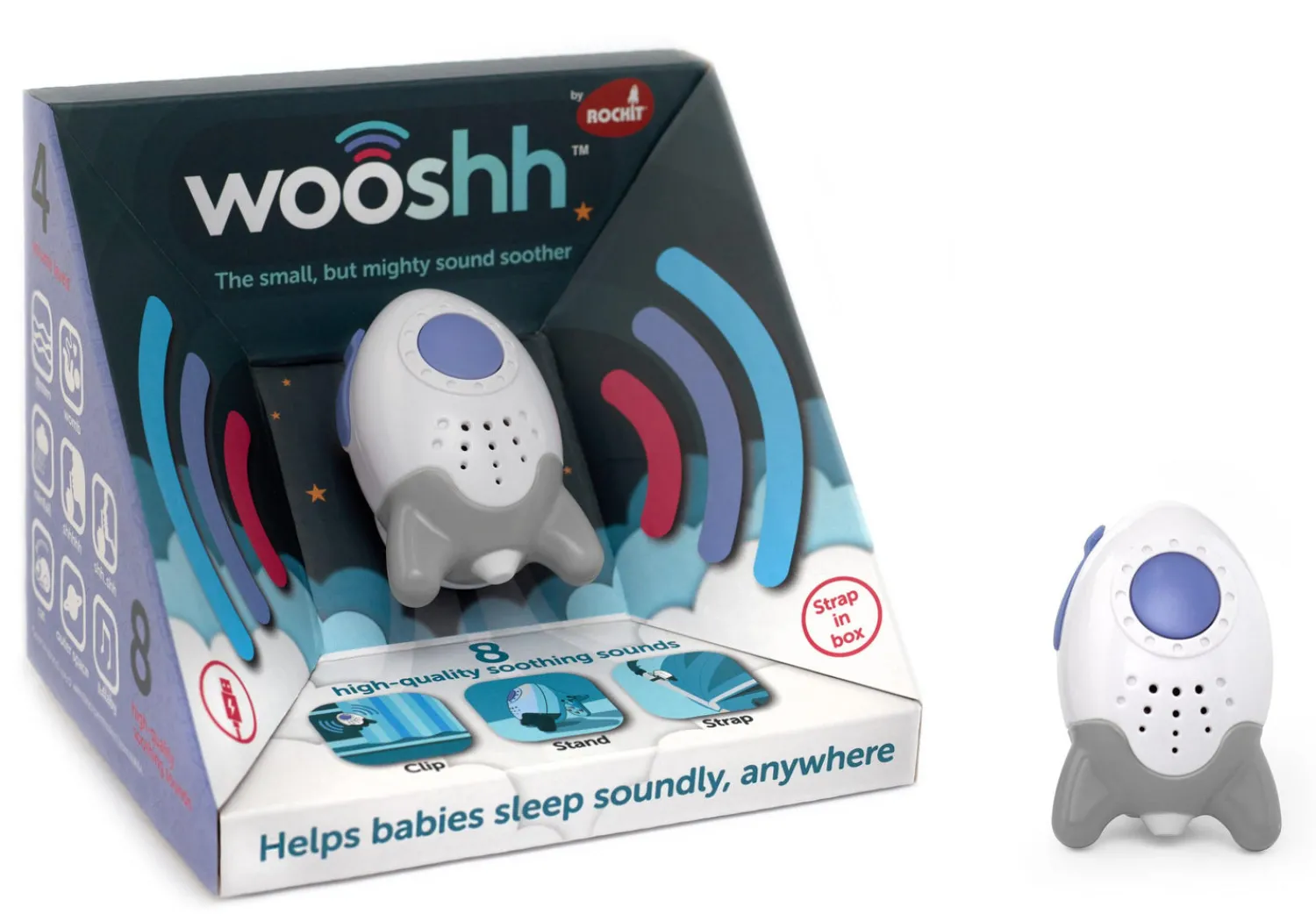 Rockit Wooshh er en lille, men kraftfuld lydmaskine, der hjælper din baby med at falde til ro og sove længere – både hjemme og på farten.